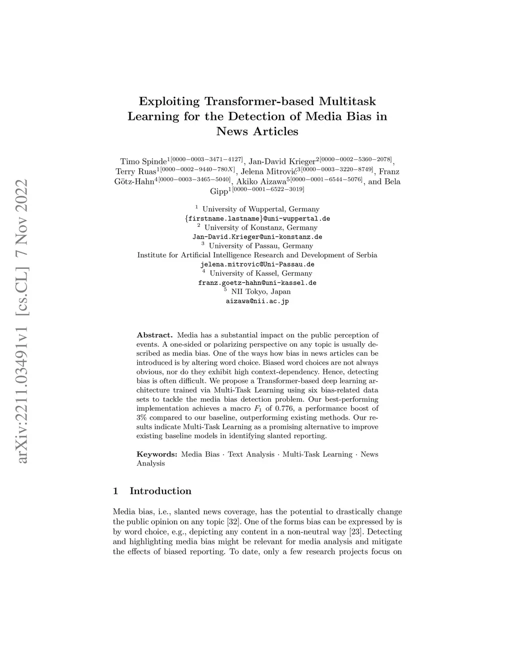 Media has a substantial impact on the public perception of events. A one-sided or polarizing perspective on any topic is usually described as media bias. One of the ways how bias in news articles can be introduced is by altering word choice. Biased word choices are not always obvious, nor do they exhibit high context-dependency. Hence, detecting bias is often difficult. We propose a Transformer-based deep learning architecture trained via Multi-Task Learning using six bias-related data sets to tackle the media bias detection problem. Our best-performing implementation achieves a macro of 0.776, a performance boost of 3\% compared to our baseline, outperforming existing methods. Our results indicate Multi-Task Learning as a promising alternative to improve existing baseline models in identifying slanted reporting.