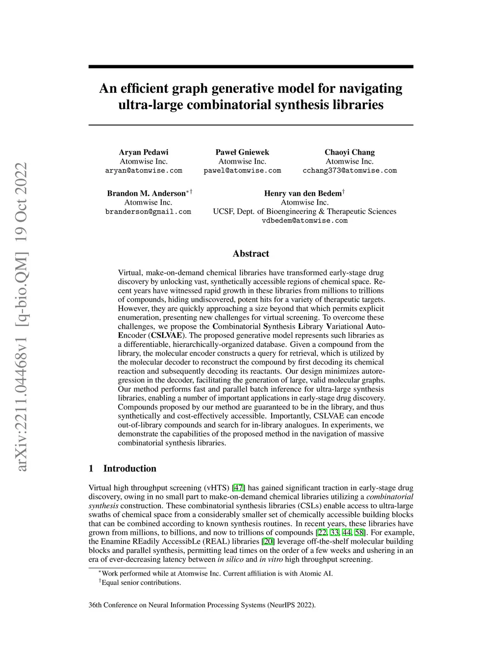 Virtual, make-on-demand chemical libraries have transformed early-stage drug discovery by unlocking vast, synthetically accessible regions of chemical space. Recent years have witnessed rapid growth in these libraries from millions to trillions of compounds, hiding undiscovered, potent hits for a variety of therapeutic targets. However, they are quickly approaching a size beyond that which permits explicit enumeration, presenting new challenges for virtual screening. To overcome these challenges, we propose the Combinatorial Synthesis Library Variational Auto-Encoder (CSLVAE). The proposed generative model represents such libraries as a differentiable, hierarchically-organized database. Given a compound from the library, the molecular encoder constructs a query for retrieval, which is utilized by the molecular decoder to reconstruct the compound by first decoding its chemical reaction and subsequently decoding its reactants. Our design minimizes autoregression in the decoder, facilitating the generation of large, valid molecular graphs. Our method performs fast and parallel batch inference for ultra-large synthesis libraries, enabling a number of important applications in early-stage drug discovery. Compounds proposed by our method are guaranteed to be in the library, and thus synthetically and cost-effectively accessible. Importantly, CSLVAE can encode out-of-library compounds and search for in-library analogues. In experiments, we demonstrate the capabilities of the proposed method in the navigation of massive combinatorial synthesis libraries.