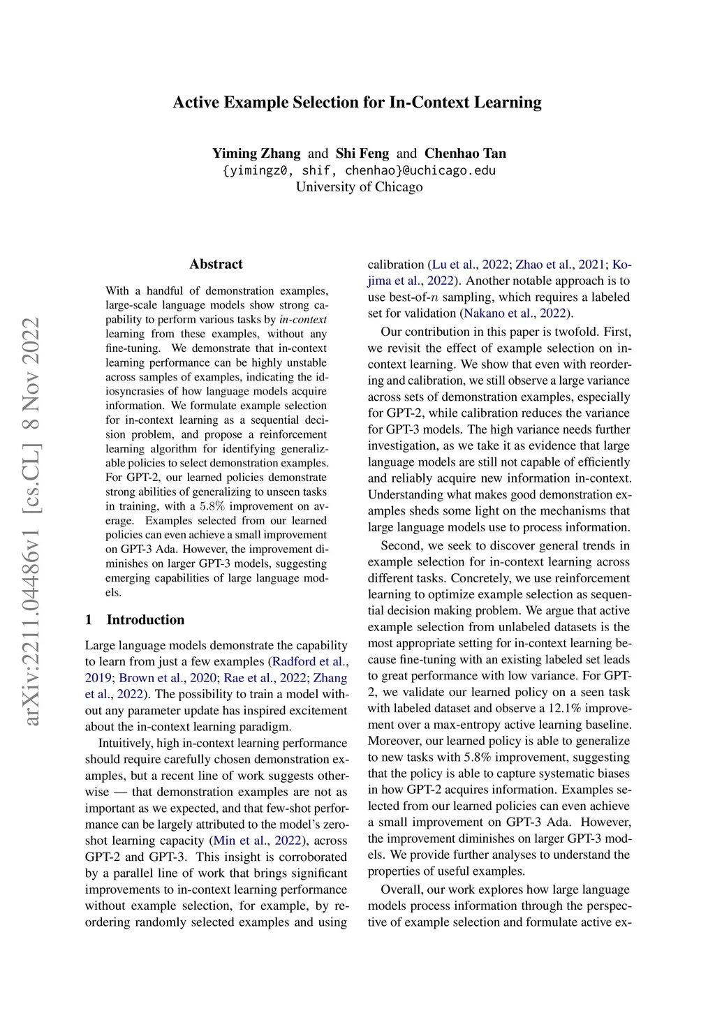 With a handful of demonstration examples, large-scale language models show strong capability to perform various tasks by in-context learning from these examples, without any fine-tuning. We demonstrate that in-context learning performance can be highly unstable across samples of examples, indicating the idiosyncrasies of how language models acquire information. We formulate example selection for in-context learning as a sequential decision problem, and propose a reinforcement learning algorithm for identifying generalizable policies to select demonstration examples. For GPT-2, our learned policies demonstrate strong abilities of generalizing to unseen tasks in training, with a improvement on average. Examples selected from our learned policies can even achieve a small improvement on GPT-3 Ada. However, the improvement diminishes on larger GPT-3 models, suggesting emerging capabilities of large language models.