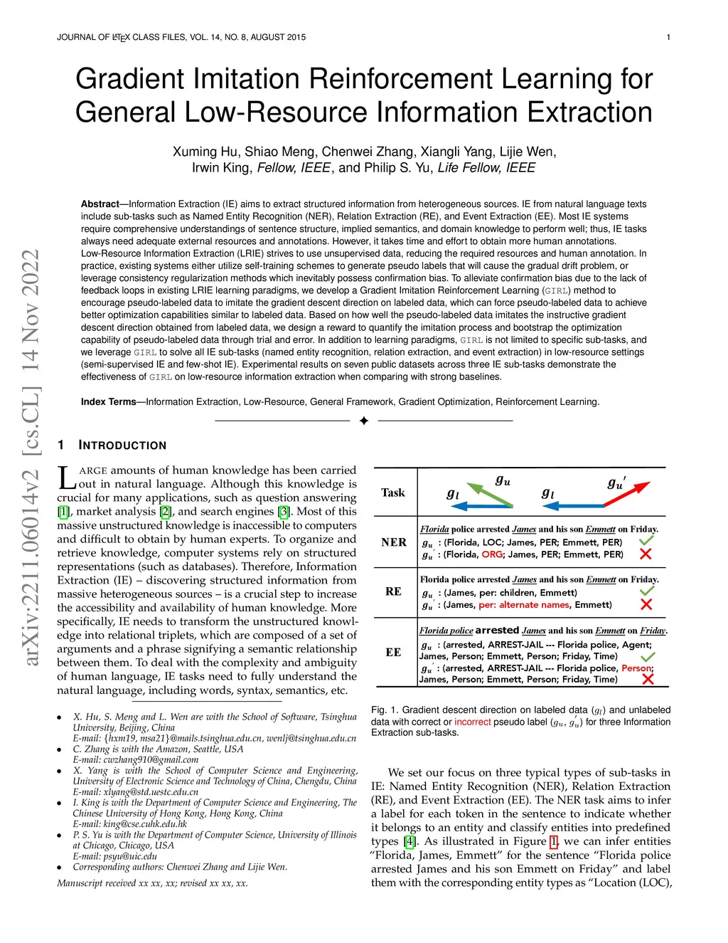 Information Extraction (IE) aims to extract structured information from heterogeneous sources. IE from natural language texts include sub-tasks such as Named Entity Recognition (NER), Relation Extraction (RE), and Event Extraction (EE). Most IE systems require comprehensive understandings of sentence structure, implied semantics, and domain knowledge to perform well; thus, IE tasks always need adequate external resources and annotations. However, it takes time and effort to obtain more human annotations. Low-Resource Information Extraction (LRIE) strives to use unsupervised data, reducing the required resources and human annotation. In practice, existing systems either utilize self-training schemes to generate pseudo labels that will cause the gradual drift problem, or leverage consistency regularization methods which inevitably possess confirmation bias. To alleviate confirmation bias due to the lack of feedback loops in existing LRIE learning paradigms, we develop a Gradient Imitation Reinforcement Learning (GIRL) method to encourage pseudo-labeled data to imitate the gradient descent direction on labeled data, which can force pseudo-labeled data to achieve better optimization capabilities similar to labeled data. Based on how well the pseudo-labeled data imitates the instructive gradient descent direction obtained from labeled data, we design a reward to quantify the imitation process and bootstrap the optimization capability of pseudo-labeled data through trial and error. In addition to learning paradigms, GIRL is not limited to specific sub-tasks, and we leverage GIRL to solve all IE sub-tasks (named entity recognition, relation extraction, and event extraction) in low-resource settings (semi-supervised IE and few-shot IE).