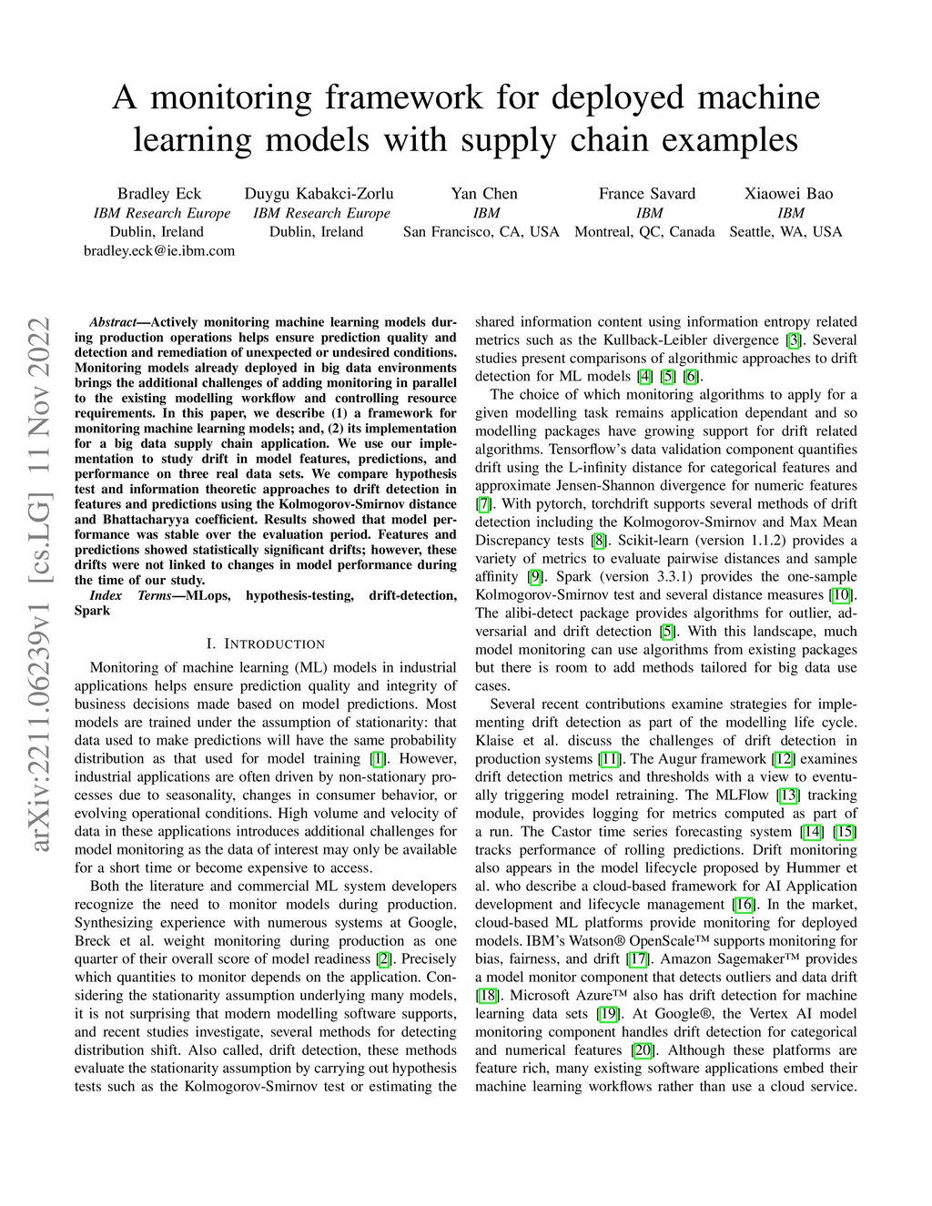 Actively monitoring machine learning models during production operations helps ensure prediction quality and detection and remediation of unexpected or undesired conditions. Monitoring models already deployed in big data environments brings the additional challenges of adding monitoring in parallel to the existing modelling workflow and controlling resource requirements. In this paper, we describe (1) a framework for monitoring machine learning models; and, (2) its implementation for a big data supply chain application. We use our implementation to study drift in model features, predictions, and performance on three real data sets. We compare hypothesis test and information theoretic approaches to drift detection in features and predictions using the Kolmogorov-Smirnov distance and Bhattacharyya coefficient. Results showed that model performance was stable over the evaluation period. Features and predictions showed statistically significant drifts; however, these drifts were not linked to changes in model performance during the time of our study.