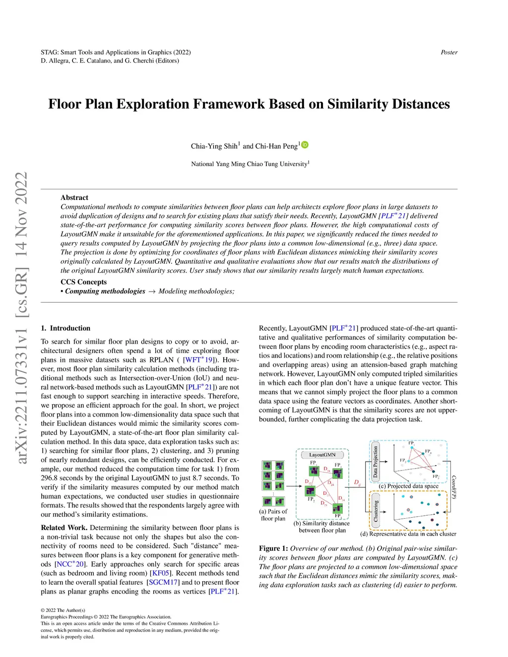 Computational methods to compute similarities between floor plans can help architects explore floor plans in large datasets to avoid duplication of designs and to search for existing plans that satisfy their needs. Recently, LayoutGMN delivered state-of-the-art performance for computing similarity scores between floor plans. However, the high computational costs of LayoutGMN make it unsuitable for the aforementioned applications. In this paper, we significantly reduced the times needed to query results computed by LayoutGMN by projecting the floor plans into a common low-dimensional (e.g., three) data space. The projection is done by optimizing for coordinates of floor plans with Euclidean distances mimicking their similarity scores originally calculated by LayoutGMN. Quantitative and qualitative evaluations show that our results match the distributions of the original LayoutGMN similarity scores. User study shows that our similarity results largely match human expectations.
