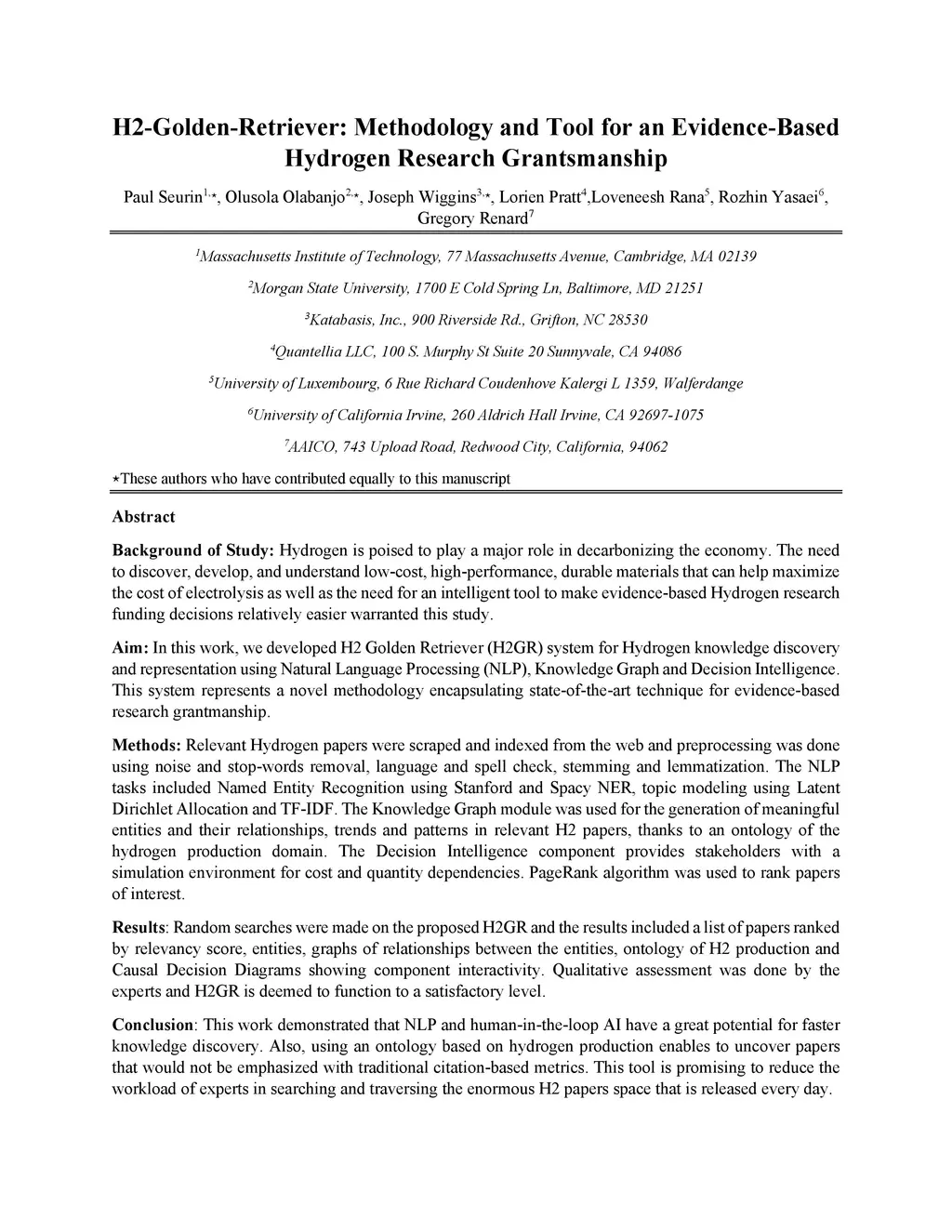 Hydrogen is poised to play a major role in decarbonizing the economy. The need to discover, develop, and understand low-cost, high-performance, durable materials that can help maximize the cost of electrolysis as well as the need for an intelligent tool to make evidence-based Hydrogen research funding decisions relatively easier warranted this study.In this work, we developed H2 Golden Retriever (H2GR) system for Hydrogen knowledge discovery and representation using Natural Language Processing (NLP), Knowledge Graph and Decision Intelligence. This system represents a novel methodology encapsulating state-of-the-art technique for evidence-based research grantmanship. Relevant Hydrogen papers were scraped and indexed from the web and preprocessing was done using noise and stop-words removal, language and spell check, stemming and lemmatization. The NLP tasks included Named Entity Recognition using Stanford and Spacy NER, topic modeling using Latent Dirichlet Allocation and TF-IDF. The Knowledge Graph module was used for the generation of meaningful entities and their relationships, trends and patterns in relevant H2 papers, thanks to an ontology of the hydrogen production domain. The Decision Intelligence component provides stakeholders with a simulation environment for cost and quantity dependencies. PageRank algorithm was used to rank papers of interest. Random searches were made on the proposed H2GR and the results included a list of papers ranked by relevancy score, entities, graphs of relationships between the entities, ontology of H2 production and Causal Decision Diagrams showing component interactivity. Qualitative assessment was done by the experts and H2GR is deemed to function to a satisfactory level.