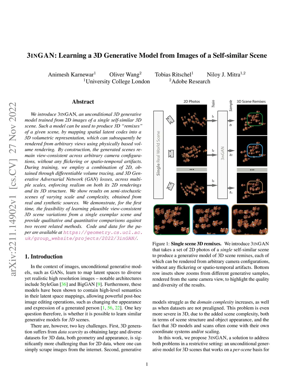 We introduce 3inGAN, an unconditional 3D generative model trained from 2D images of a single self-similar 3D scene. Such a model can be used to produce 3D "remixes" of a given scene, by mapping spatial latent codes into a 3D volumetric representation, which can subsequently be rendered from arbitrary views using physically based volume rendering. By construction, the generated scenes remain view-consistent across arbitrary camera configurations, without any flickering or spatio-temporal artifacts. During training, we employ a combination of 2D, obtained through differentiable volume tracing, and 3D Generative Adversarial Network (GAN) losses, across multiple scales, enforcing realism on both its 3D structure and the 2D renderings. We show results on semi-stochastic scenes of varying scale and complexity, obtained from real and synthetic sources. We demonstrate, for the first time, the feasibility of learning plausible view-consistent 3D scene variations from a single exemplar scene and provide qualitative and quantitative comparisons against recent related methods.