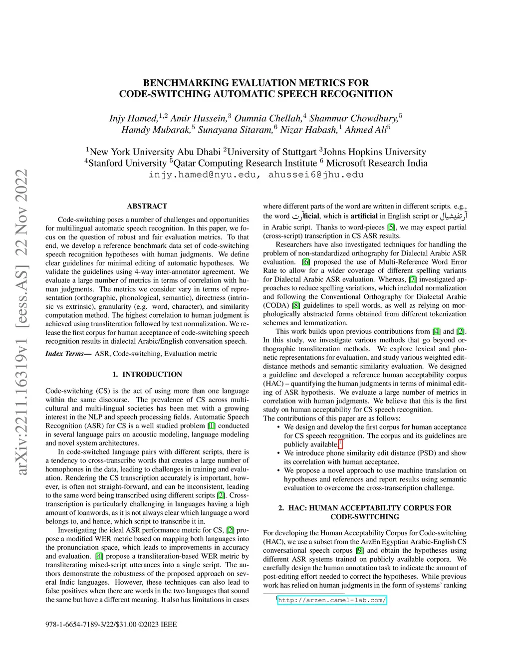Code-switching poses a number of challenges and opportunities for multilingual automatic speech recognition. In this paper, we focus on the question of robust and fair evaluation metrics. To that end, we develop a reference benchmark data set of code-switching speech recognition hypotheses with human judgments. We define clear guidelines for minimal editing of automatic hypotheses. We validate the guidelines using 4-way inter-annotator agreement. We evaluate a large number of metrics in terms of correlation with human judgments. The metrics we consider vary in terms of representation (orthographic, phonological, semantic), directness (intrinsic vs extrinsic), granularity (e.g. word, character), and similarity computation method. The highest correlation to human judgment is achieved using transliteration followed by text normalization. We release the first corpus for human acceptance of code-switching speech recognition results in dialectal Arabic/English conversation speech.
