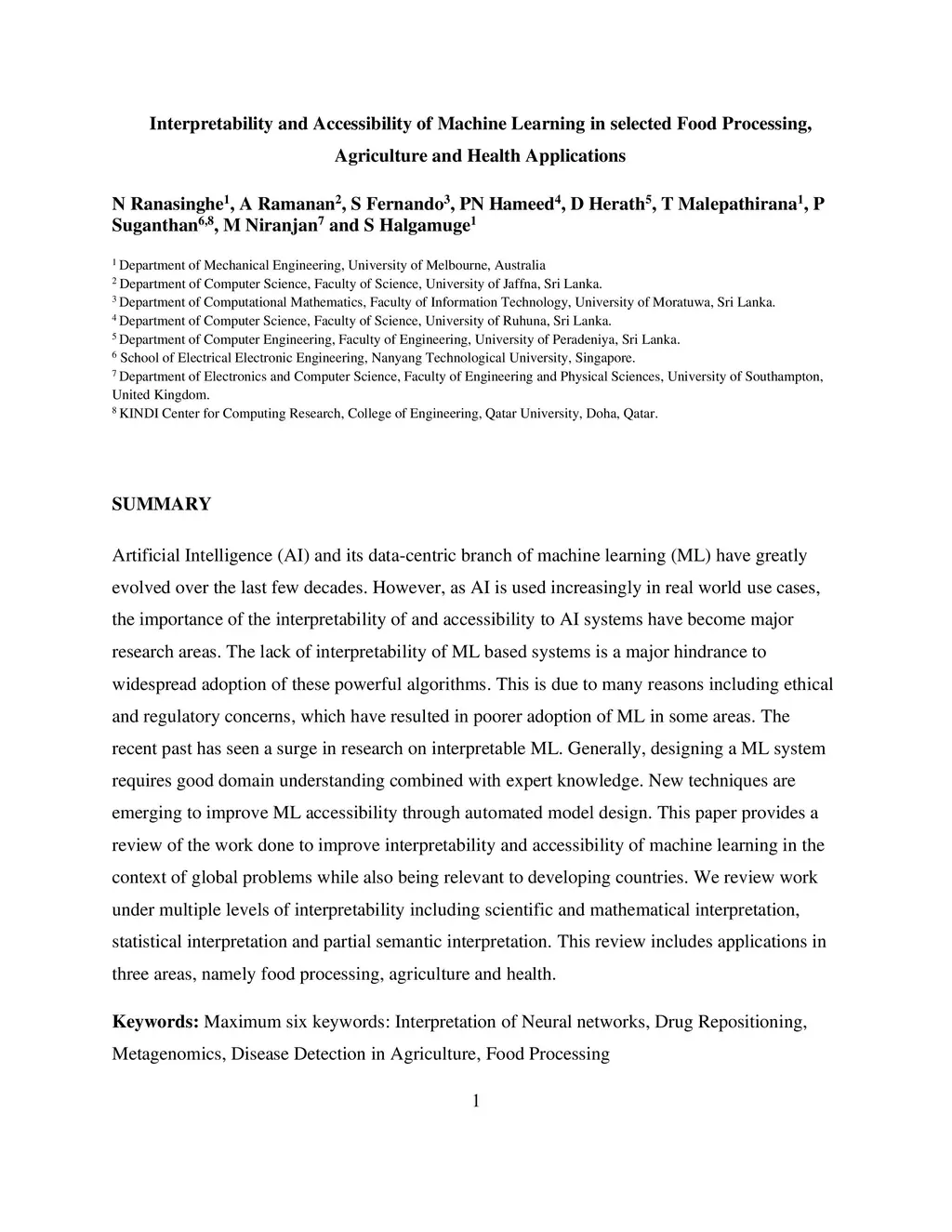 Artificial Intelligence (AI) and its data-centric branch of machine learning (ML) have greatly evolved over the last few decades. However, as AI is used increasingly in real world use cases, the importance of the interpretability of and accessibility to AI systems have become major research areas. The lack of interpretability of ML based systems is a major hindrance to widespread adoption of these powerful algorithms. This is due to many reasons including ethical and regulatory concerns, which have resulted in poorer adoption of ML in some areas. The recent past has seen a surge in research on interpretable ML. Generally, designing a ML system requires good domain understanding combined with expert knowledge. New techniques are emerging to improve ML accessibility through automated model design. This paper provides a review of the work done to improve interpretability and accessibility of machine learning in the context of global problems while also being relevant to developing countries. We review work under multiple levels of interpretability including scientific and mathematical interpretation, statistical interpretation and partial semantic interpretation. This review includes applications in three areas, namely food processing, agriculture and health.