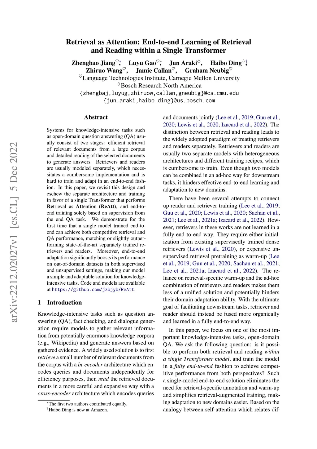 Systems for knowledge-intensive tasks such as open-domain question answering (QA) usually consist of two stages: efficient retrieval of relevant documents from a large corpus and detailed reading of the selected documents to generate answers. Retrievers and readers are usually modeled separately, which necessitates a cumbersome implementation and is hard to train and adapt in an end-to-end fashion. In this paper, we revisit this design and eschew the separate architecture and training in favor of a single Transformer that performs Retrieval as Attention (ReAtt), and end-to-end training solely based on supervision from the end QA task. We demonstrate for the first time that a single model trained end-to-end can achieve both competitive retrieval and QA performance, matching or slightly outperforming state-of-the-art separately trained retrievers and readers. Moreover, end-to-end adaptation significantly boosts its performance on out-of-domain datasets in both supervised and unsupervised settings, making our model a simple and adaptable solution for knowledge-intensive tasks. Code and models are available at https://github.com/jzbjyb/ReAtt.