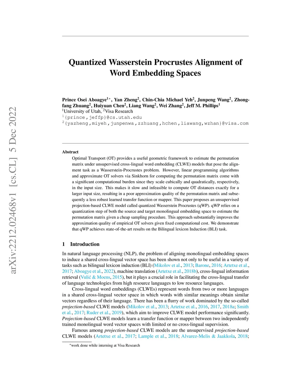 Optimal Transport (OT) provides a useful geometric framework to estimate the permutation matrix under unsupervised cross-lingual word embedding (CLWE) models that pose the alignment task as a Wasserstein-Procrustes problem. However, linear programming algorithms and approximate OT solvers via Sinkhorn for computing the permutation matrix come with a significant computational burden since they scale cubically and quadratically, respectively, in the input size. This makes it slow and infeasible to compute OT distances exactly for a larger input size, resulting in a poor approximation quality of the permutation matrix and subsequently a less robust learned transfer function or mapper. This paper proposes an unsupervised projection-based CLWE model called quantized Wasserstein Procrustes (qWP). qWP relies on a quantization step of both the source and target monolingual embedding space to estimate the permutation matrix given a cheap sampling procedure. This approach substantially improves the approximation quality of empirical OT solvers given fixed computational cost. We demonstrate that qWP achieves state-of-the-art results on the Bilingual lexicon Induction (BLI) task.