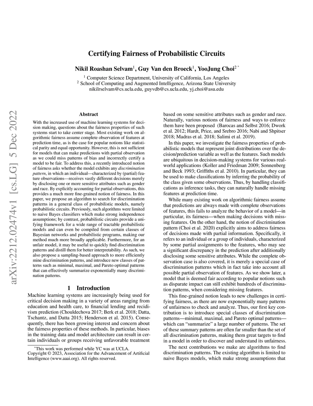 With the increased use of machine learning systems for decision making, questions about the fairness properties of such systems start to take center stage. Most existing work on algorithmic fairness assume complete observation of features at prediction time, as is the case for popular notions like statistical parity and equal opportunity. However, this is not sufficient for models that can make predictions with partial observation as we could miss patterns of bias and incorrectly certify a model to be fair. To address this, a recently introduced notion of fairness asks whether the model exhibits any discrimination pattern, in which an individual characterized by (partial) feature observations, receives vastly different decisions merely by disclosing one or more sensitive attributes such as gender and race. By explicitly accounting for partial observations, this provides a much more fine-grained notion of fairness. In this paper, we propose an algorithm to search for discrimination patterns in a general class of probabilistic models, namely probabilistic circuits. Previously, such algorithms were limited to naive Bayes classifiers which make strong independence assumptions; by contrast, probabilistic circuits provide a unifying framework for a wide range of tractable probabilistic models and can even be compiled from certain classes of Bayesian networks and probabilistic programs, making our method much more broadly applicable. Furthermore, for an unfair model, it may be useful to quickly find discrimination patterns and distill them for better interpretability. As such, we also propose a sampling-based approach to more efficiently mine discrimination patterns, and introduce new classes of patterns such as minimal, maximal, and Pareto optimal patterns that can effectively summarize exponentially many discrimination patterns