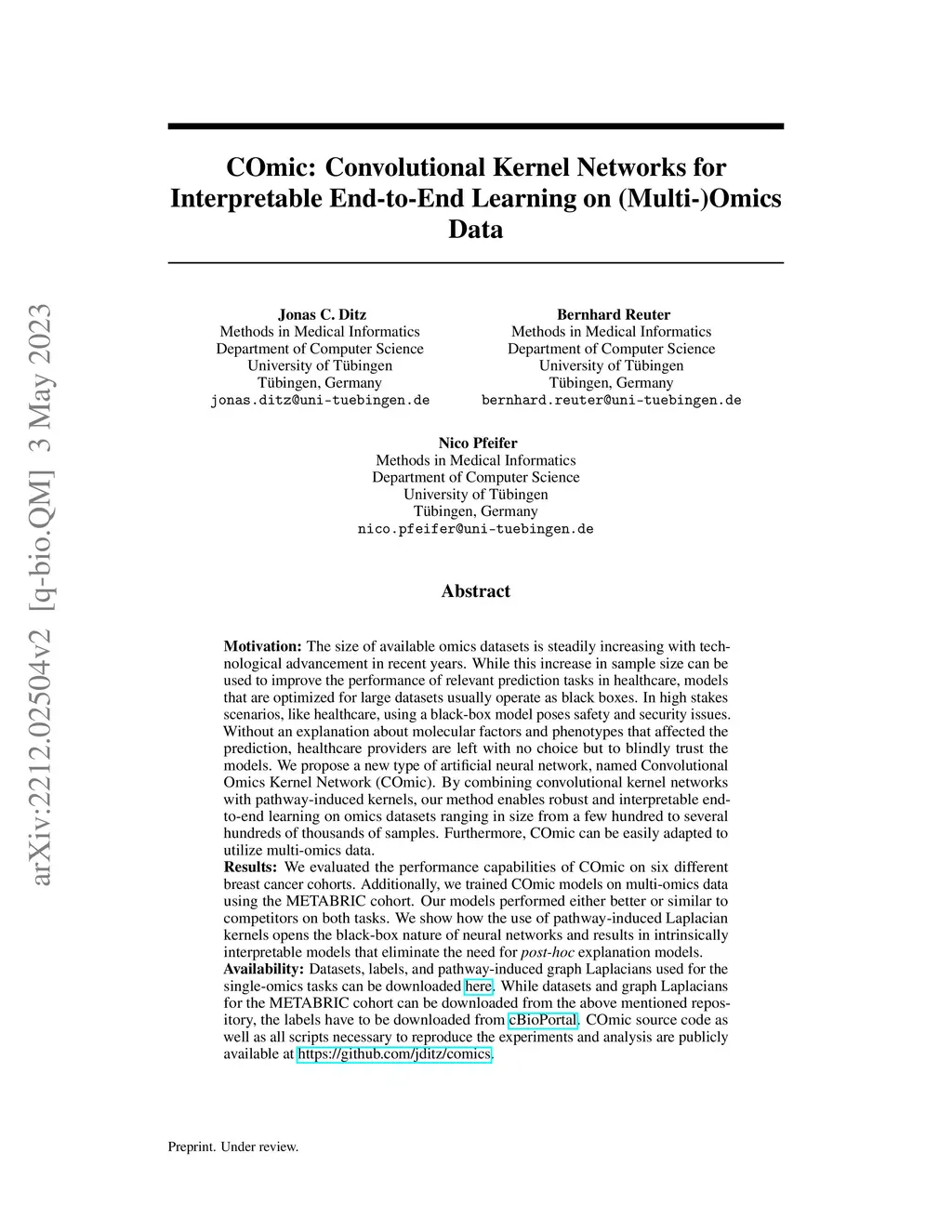 Motivation: The size of available omics datasets is steadily increasing with technological advancement in recent years. While this increase in sample size can be used to improve the performance of relevant prediction tasks in healthcare, models that are optimized for large datasets usually operate as black boxes. In high stakes scenarios, like healthcare, using a black-box model poses safety and security issues. Without an explanation about molecular factors and phenotypes that affected the prediction, healthcare providers are left with no choice but to blindly trust the models. We propose a new type of artificial neural network, named Convolutional Omics Kernel Network (COmic). By combining convolutional kernel networks with pathway-induced kernels, our method enables robust and interpretable end-to-end learning on omics datasets ranging in size from a few hundred to several hundreds of thousands of samples. Furthermore, COmic can be easily adapted to utilize multi-omics data. Results: We evaluated the performance capabilities of COmic on six different breast cancer cohorts. Additionally, we trained COmic models on multi-omics data using the METABRIC cohort. Our models performed either better or similar to competitors on both tasks. We show how the use of pathway-induced Laplacian kernels opens the black-box nature of neural networks and results in intrinsically interpretable models that eliminate the need for post-hoc explanation models.