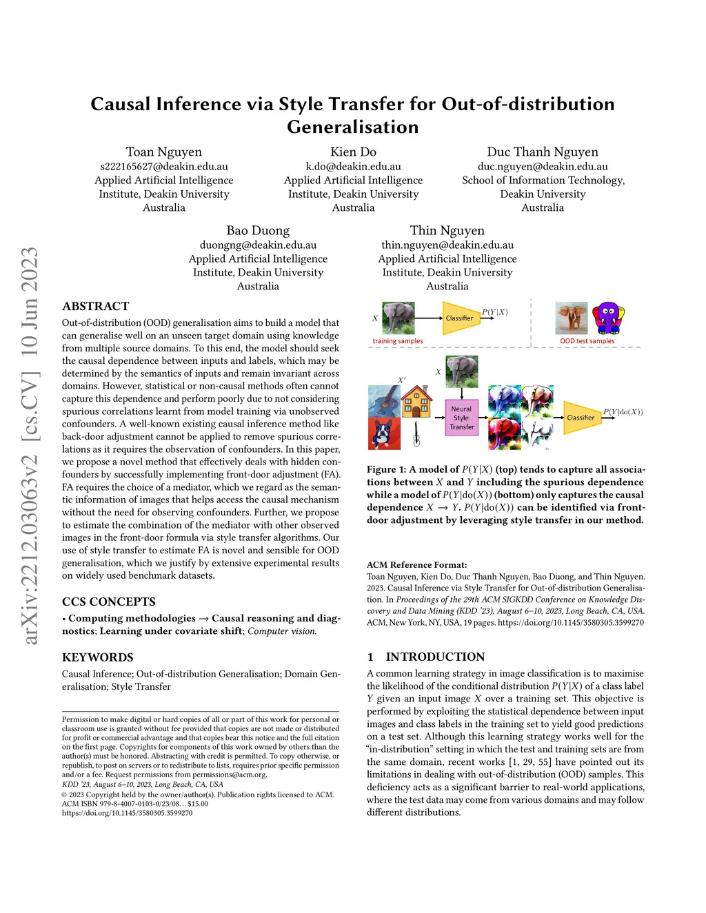 Out-of-distribution (OOD) generalisation aims to build a model that can generalise well on an unseen target domain using knowledge from multiple source domains. To this end, the model should seek the causal dependence between inputs and labels, which may be determined by the semantics of inputs and remain invariant across domains. However, statistical or non-causal methods often cannot capture this dependence and perform poorly due to not considering spurious correlations learnt from model training via unobserved confounders. A well-known existing causal inference method like back-door adjustment cannot be applied to remove spurious correlations as it requires the observation of confounders. In this paper, we propose a novel method that effectively deals with hidden confounders by successfully implementing front-door adjustment (FA). FA requires the choice of a mediator, which we regard as the semantic information of images that helps access the causal mechanism without the need for observing confounders. Further, we propose to estimate the combination of the mediator with other observed images in the front-door formula via style transfer algorithms. Our use of style transfer to estimate FA is novel and sensible for OOD generalisation, which we justify by extensive experimental results on widely used benchmark datasets.