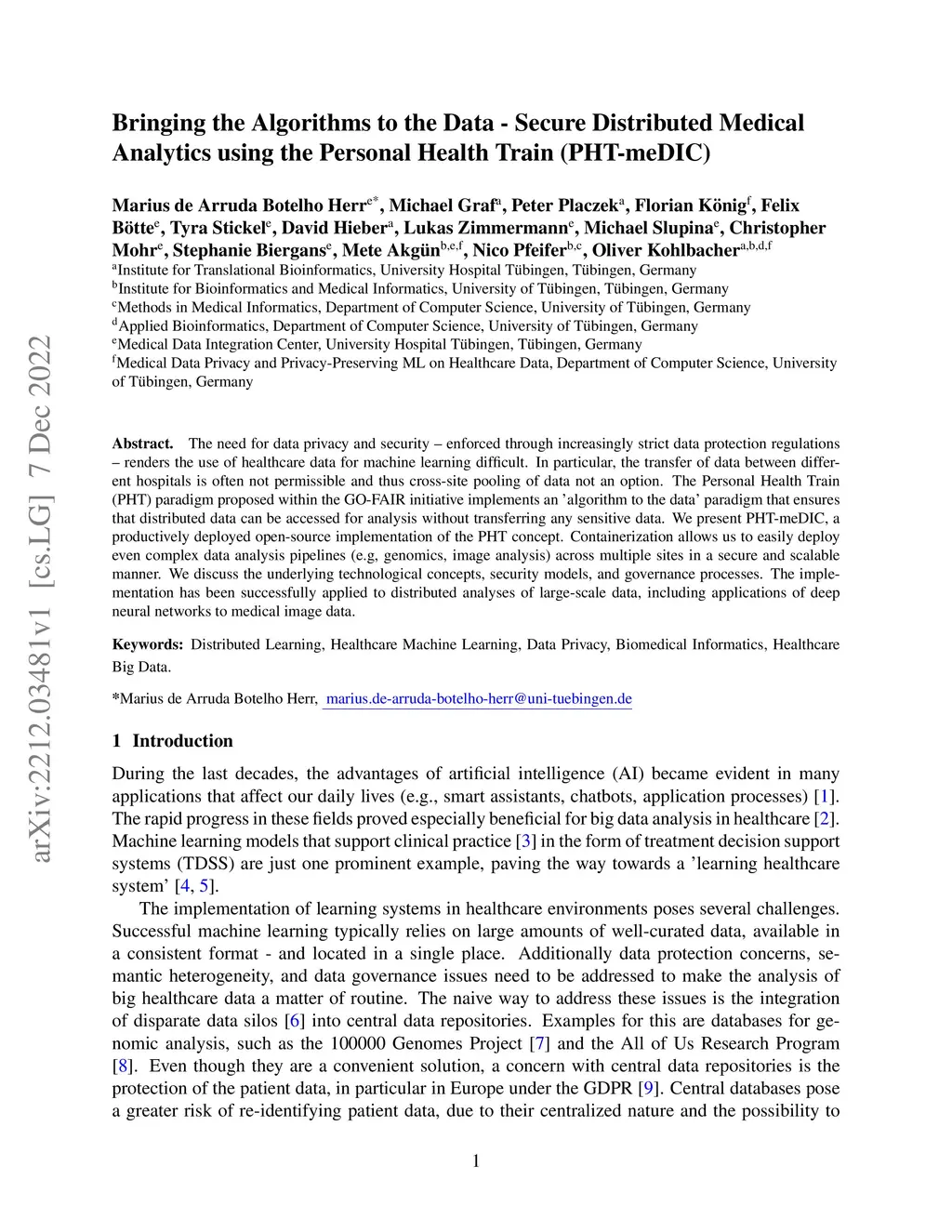 The need for data privacy and security -- enforced through increasingly strict data protection regulations -- renders the use of healthcare data for machine learning difficult. In particular, the transfer of data between different hospitals is often not permissible and thus cross-site pooling of data not an option. The Personal Health Train (PHT) paradigm proposed within the GO-FAIR initiative implements an álgorithm to the data' paradigm that ensures that distributed data can be accessed for analysis without transferring any sensitive data. We present PHT-meDIC, a productively deployed open-source implementation of the PHT concept. Containerization allows us to easily deploy even complex data analysis pipelines (e.g, genomics, image analysis) across multiple sites in a secure and scalable manner. We discuss the underlying technological concepts, security models, and governance processes. The implementation has been successfully applied to distributed analyses of large-scale data, including applications of deep neural networks to medical image data.