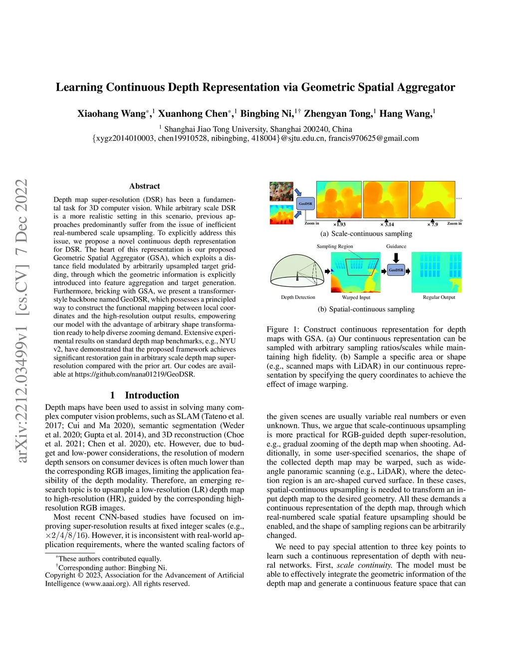 Depth map super-resolution (DSR) has been a fundamental task for 3D computer vision. While arbitrary scale DSR is a more realistic setting in this scenario, previous approaches predominantly suffer from the issue of inefficient real-numbered scale upsampling. To explicitly address this issue, we propose a novel continuous depth representation for DSR. The heart of this representation is our proposed Geometric Spatial Aggregator (GSA), which exploits a distance field modulated by arbitrarily upsampled target gridding, through which the geometric information is explicitly introduced into feature aggregation and target generation. Furthermore, bricking with GSA, we present a transformer-style backbone named GeoDSR, which possesses a principled way to construct the functional mapping between local coordinates and the high-resolution output results, empowering our model with the advantage of arbitrary shape transformation ready to help diverse zooming demand. Extensive experimental results on standard depth map benchmarks, e.g., NYU v2, have demonstrated that the proposed framework achieves significant restoration gain in arbitrary scale depth map super-resolution compared with the prior art. Our codes are available at https://github.com/nana01219/GeoDSR.