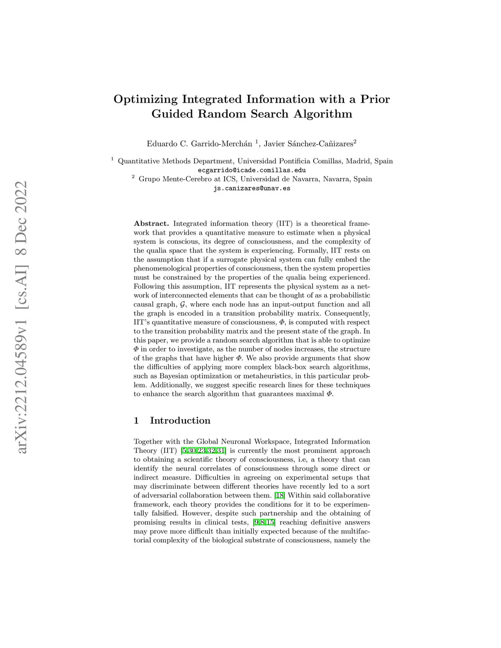 Integrated information theory (IIT) is a theoretical framework that provides a quantitative measure to estimate when a physical system is conscious, its degree of consciousness, and the complexity of the qualia space that the system is experiencing. Formally, IIT rests on the assumption that if a surrogate physical system can fully embed the phenomenological properties of consciousness, then the system properties must be constrained by the properties of the qualia being experienced. Following this assumption, IIT represents the physical system as a network of interconnected elements that can be thought of as a probabilistic causal graph, , where each node has an input-output function and all the graph is encoded in a transition probability matrix. Consequently, IIT's quantitative measure of consciousness, , is computed with respect to the transition probability matrix and the present state of the graph. In this paper, we provide a random search algorithm that is able to optimize in order to investigate, as the number of nodes increases, the structure of the graphs that have higher . We also provide arguments that show the difficulties of applying more complex black-box search algorithms, such as Bayesian optimization or metaheuristics, in this particular problem. Additionally, we suggest specific research lines for these techniques to enhance the search algorithm that guarantees maximal .