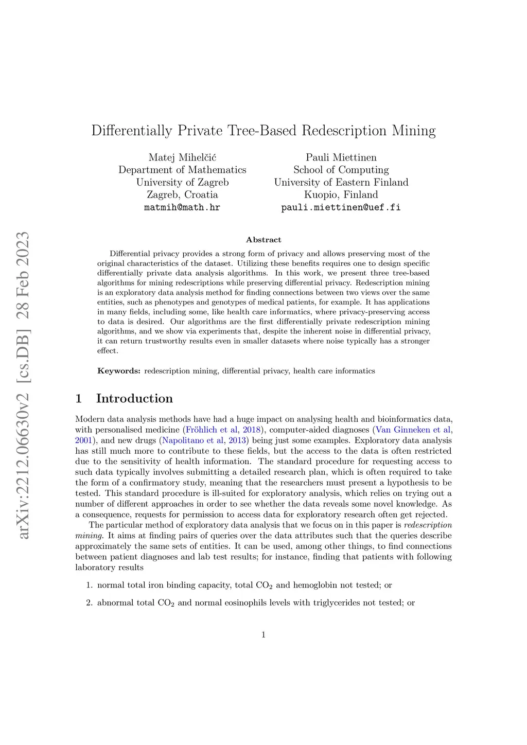 Differential privacy provides a strong form of privacy and allows preserving most of the original characteristics of the dataset. Utilizing these benefits requires one to design specific differentially private data analysis algorithms. In this work, we present three tree-based algorithms for mining redescriptions while preserving differential privacy. Redescription mining is an exploratory data analysis method for finding connections between two views over the same entities, such as phenotypes and genotypes of medical patients, for example. It has applications in many fields, including some, like health care informatics, where privacy-preserving access to data is desired. Our algorithms are the first differentially private redescription mining algorithms, and we show via experiments that, despite the inherent noise in differential privacy, it can return trustworthy results even in smaller datasets where noise typically has a stronger effect.