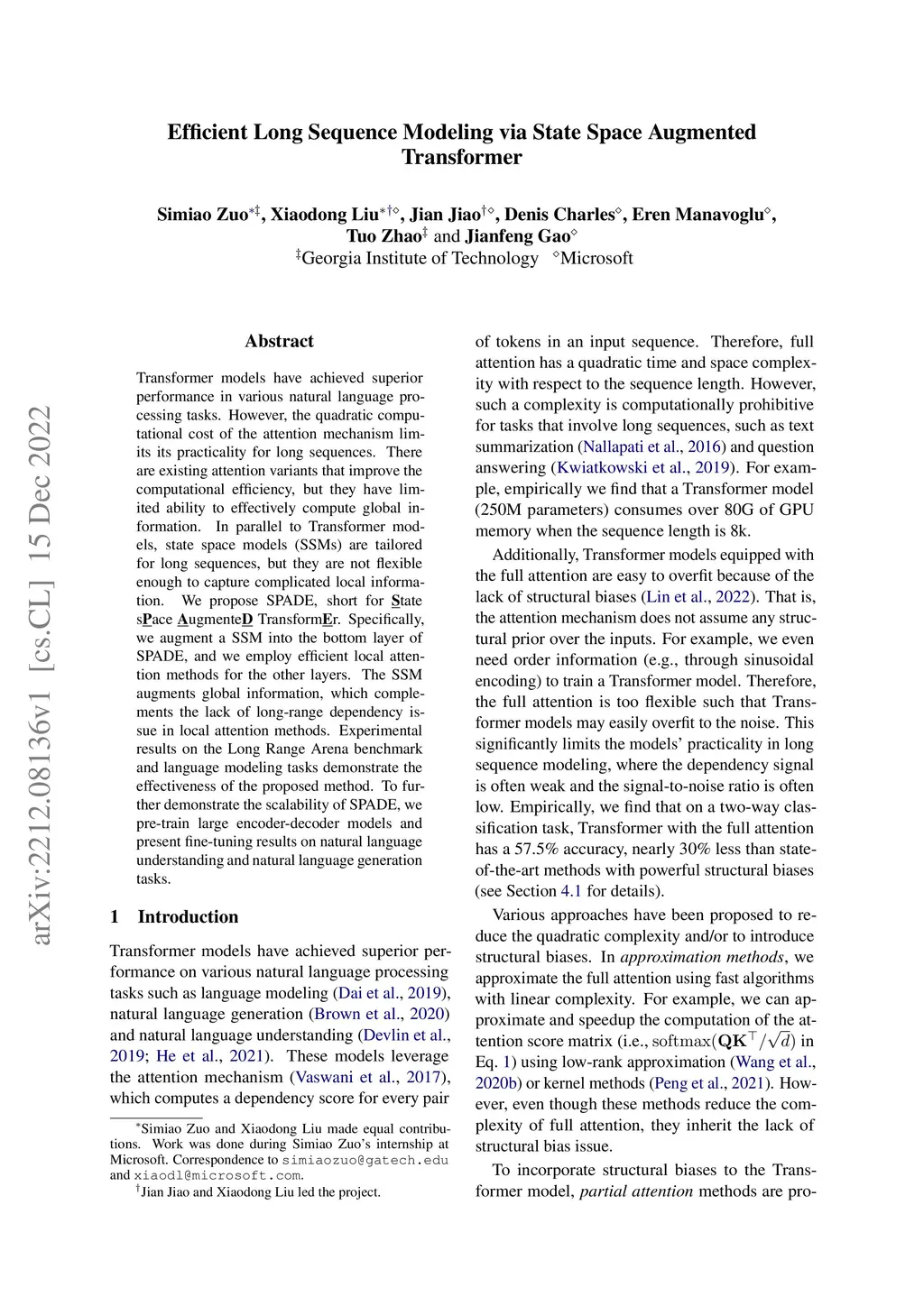 Transformer models have achieved superior performance in various natural language processing tasks. However, the quadratic computational cost of the attention mechanism limits its practicality for long sequences. There are existing attention variants that improve the computational efficiency, but they have limited ability to effectively compute global information. In parallel to Transformer models, state space models (SSMs) are tailored for long sequences, but they are not flexible enough to capture complicated local information. We propose SPADE, short for tate sace ugmente Transformr. Specifically, we augment a SSM into the bottom layer of SPADE, and we employ efficient local attention methods for the other layers. The SSM augments global information, which complements the lack of long-range dependency issue in local attention methods. Experimental results on the Long Range Arena benchmark and language modeling tasks demonstrate the effectiveness of the proposed method. To further demonstrate the scalability of SPADE, we pre-train large encoder-decoder models and present fine-tuning results on natural language understanding and natural language generation tasks.