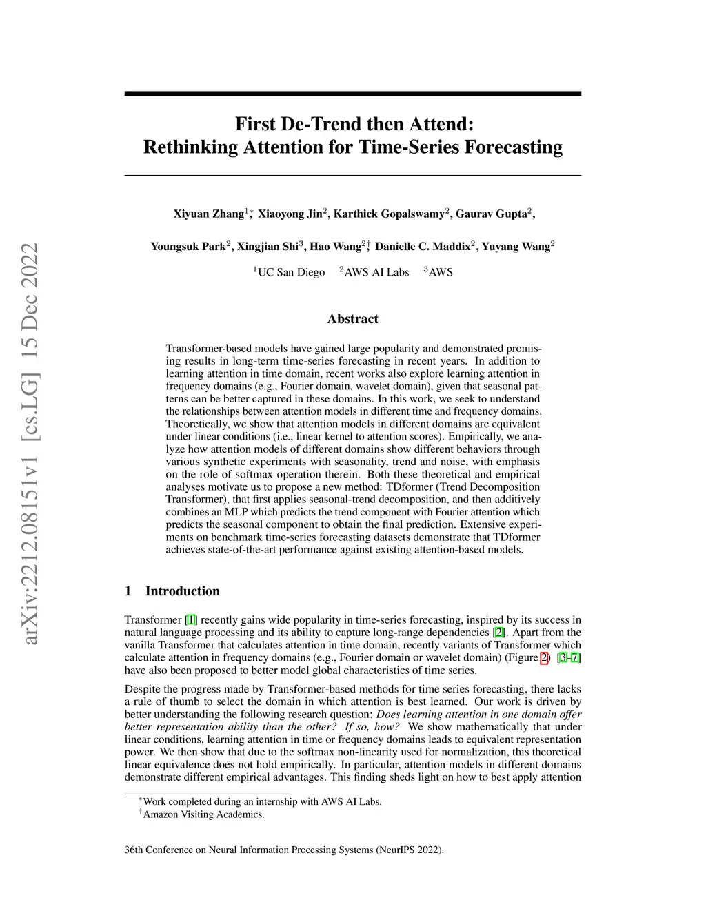 Transformer-based models have gained large popularity and demonstrated promising results in long-term time-series forecasting in recent years. In addition to learning attention in time domain, recent works also explore learning attention in frequency domains (e.g., Fourier domain, wavelet domain), given that seasonal patterns can be better captured in these domains. In this work, we seek to understand the relationships between attention models in different time and frequency domains. Theoretically, we show that attention models in different domains are equivalent under linear conditions (i.e., linear kernel to attention scores). Empirically, we analyze how attention models of different domains show different behaviors through various synthetic experiments with seasonality, trend and noise, with emphasis on the role of softmax operation therein. Both these theoretical and empirical analyses motivate us to propose a new method: TDformer (Trend Decomposition Transformer), that first applies seasonal-trend decomposition, and then additively combines an MLP which predicts the trend component with Fourier attention which predicts the seasonal component to obtain the final prediction. Extensive experiments on benchmark time-series forecasting datasets demonstrate that TDformer achieves state-of-the-art performance against existing attention-based models.
