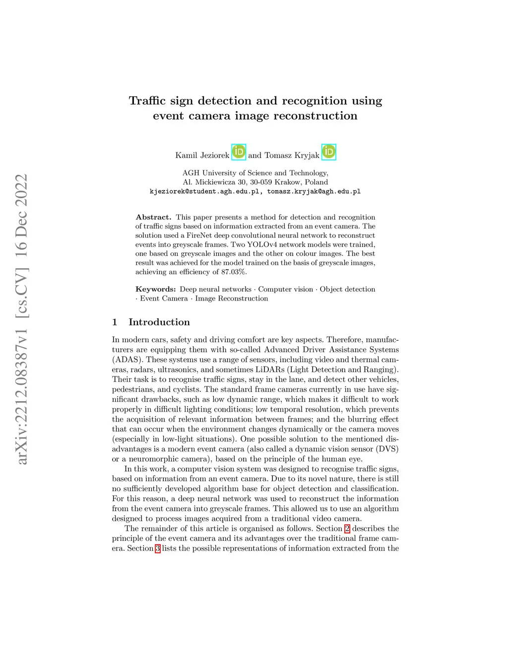 This paper presents a method for detection and recognition of traffic signs based on information extracted from an event camera. The solution used a FireNet deep convolutional neural network to reconstruct events into greyscale frames. Two YOLOv4 network models were trained, one based on greyscale images and the other on colour images. The best result was achieved for the model trained on the basis of greyscale images, achieving an efficiency of 87.03%.