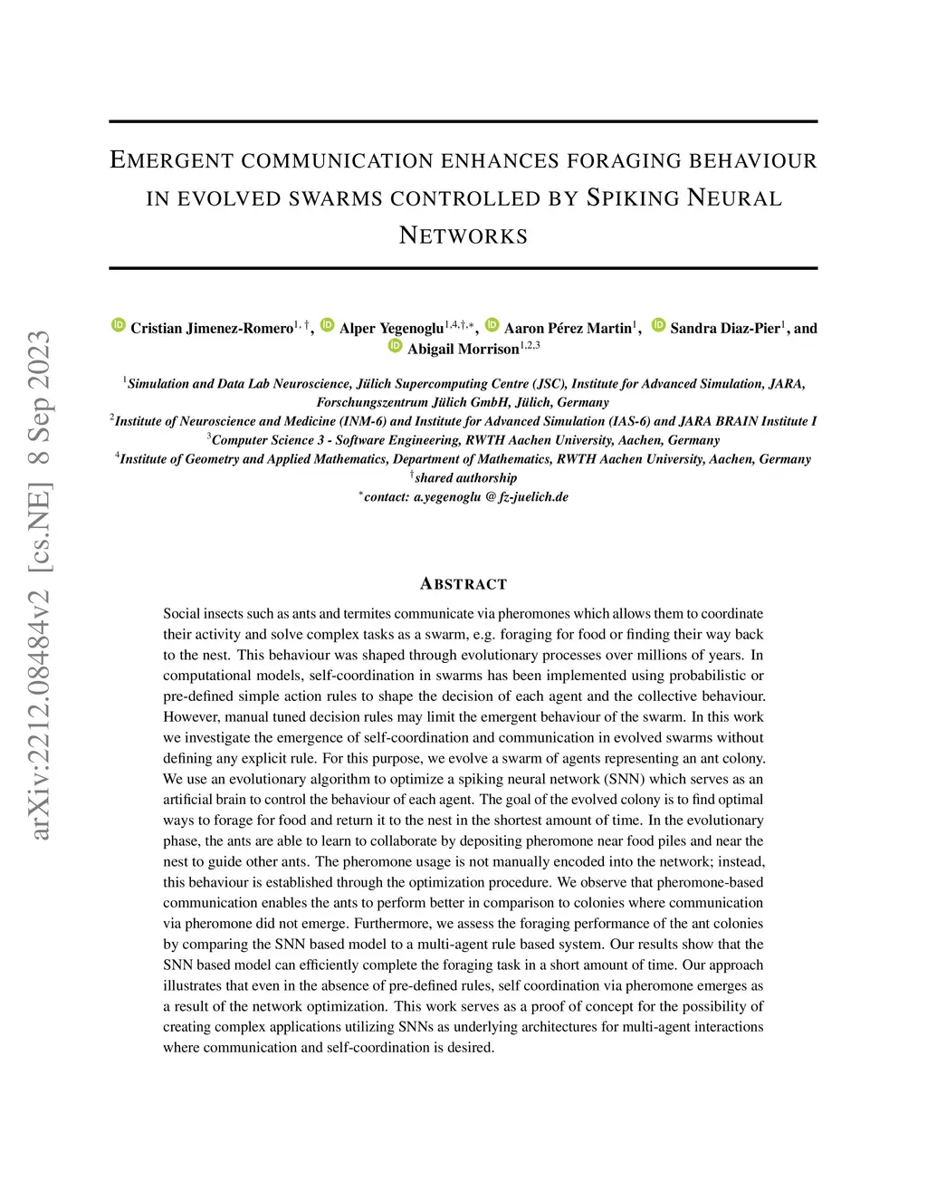 Social insects such as ants communicate via pheromones which allows them to coordinate their activity and solve complex tasks as a swarm, e.g. foraging for food. This behavior was shaped through evolutionary processes. In computational models, self-coordination in swarms has been implemented using probabilistic or simple action rules to shape the decision of each agent and the collective behavior. However, manual tuned decision rules may limit the behavior of the swarm. In this work we investigate the emergence of self-coordination and communication in evolved swarms without defining any explicit rule. We evolve a swarm of agents representing an ant colony. We use an evolutionary algorithm to optimize a spiking neural network (SNN) which serves as an artificial brain to control the behavior of each agent. The goal of the evolved colony is to find optimal ways to forage for food and return it to the nest in the shortest amount of time. In the evolutionary phase, the ants are able to learn to collaborate by depositing pheromone near food piles and near the nest to guide other ants. The pheromone usage is not manually encoded into the network; instead, this behavior is established through the optimization procedure. We observe that pheromone-based communication enables the ants to perform better in comparison to colonies where communication via pheromone did not emerge. We assess the foraging performance by comparing the SNN based model to a rule based system. Our results show that the SNN based model can efficiently complete the foraging task in a short amount of time. Our approach illustrates self coordination via pheromone emerges as a result of the network optimization. This work serves as a proof of concept for the possibility of creating complex applications utilizing SNNs as underlying architectures for multi-agent interactions where communication and self-coordination is desired.