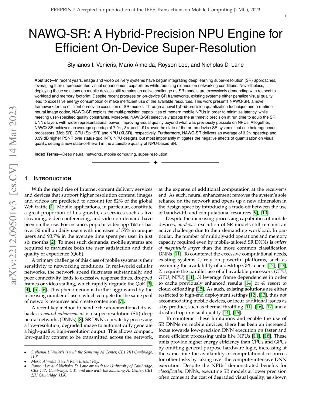 In recent years, image and video delivery systems have begun integrating deep learning super-resolution (SR) approaches, leveraging their unprecedented visual enhancement capabilities while reducing reliance on networking conditions. Nevertheless, deploying these solutions on mobile devices still remains an active challenge as SR models are excessively demanding with respect to workload and memory footprint. Despite recent progress on on-device SR frameworks, existing systems either penalize visual quality, lead to excessive energy consumption or make inefficient use of the available resources. This work presents NAWQ-SR, a novel framework for the efficient on-device execution of SR models. Through a novel hybrid-precision quantization technique and a runtime neural image codec, NAWQ-SR exploits the multi-precision capabilities of modern mobile NPUs in order to minimize latency, while meeting user-specified quality constraints. Moreover, NAWQ-SR selectively adapts the arithmetic precision at run time to equip the SR DNN's layers with wider representational power, improving visual quality beyond what was previously possible on NPUs. Altogether, NAWQ-SR achieves an average speedup of 7.9x, 3x and 1.91x over the state-of-the-art on-device SR systems that use heterogeneous processors (MobiSR), CPU (SplitSR) and NPU (XLSR), respectively. Furthermore, NAWQ-SR delivers an average of 3.2x speedup and 0.39 dB higher PSNR over status-quo INT8 NPU designs, but most importantly mitigates the negative effects of quantization on visual quality, setting a new state-of-the-art in the attainable quality of NPU-based SR.