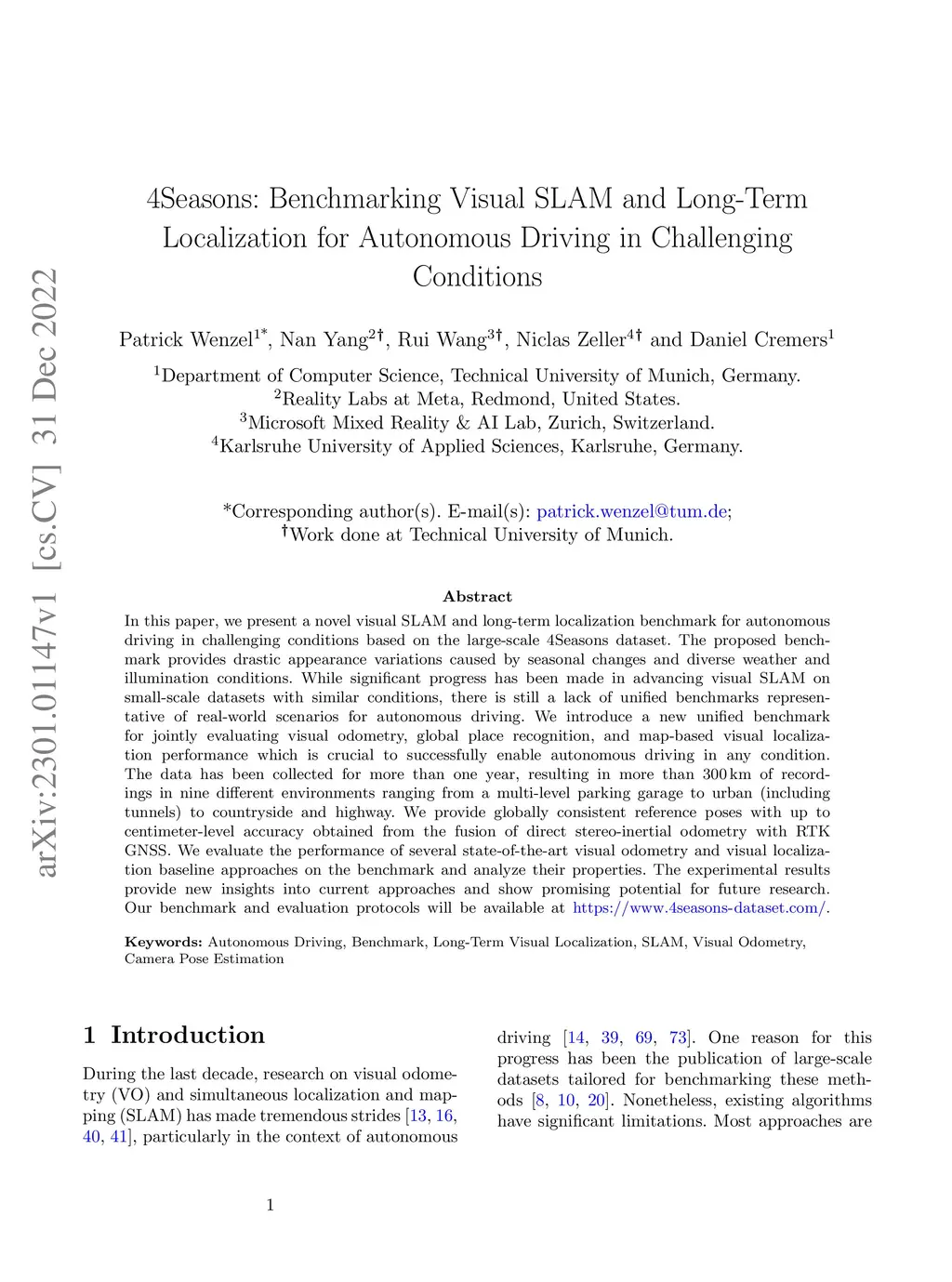 4Seasons: Benchmarking Visual SLAM and Long-Term Localization for Autonomous Driving in Challenging Conditions