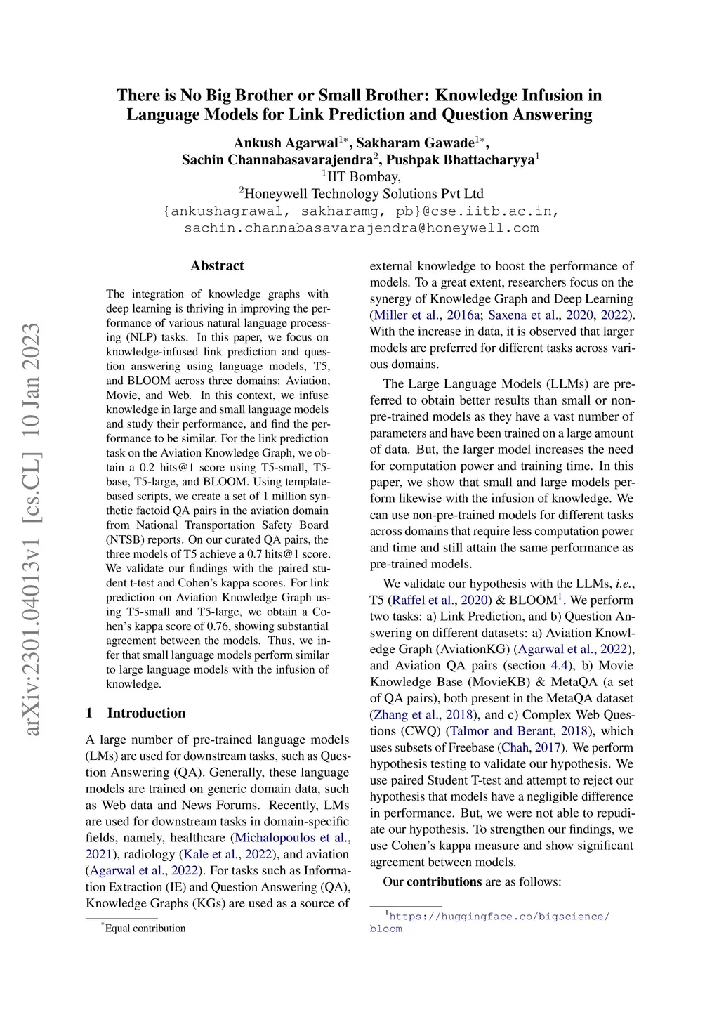 The integration of knowledge graphs with deep learning is thriving in improving the performance of various natural language processing (NLP) tasks. In this paper, we focus on knowledge-infused link prediction and question answering using language models, T5, and BLOOM across three domains: Aviation, Movie, and Web. In this context, we infuse knowledge in large and small language models and study their performance, and find the performance to be similar. For the link prediction task on the Aviation Knowledge Graph, we obtain a 0.2 hits@1 score using T5-small, T5-base, T5-large, and BLOOM. Using template-based scripts, we create a set of 1 million synthetic factoid QA pairs in the aviation domain from National Transportation Safety Board (NTSB) reports. On our curated QA pairs, the three models of T5 achieve a 0.7 hits@1 score. We validate out findings with the paired student t-test and Cohen's kappa scores. For link prediction on Aviation Knowledge Graph using T5-small and T5-large, we obtain a Cohen's kappa score of 0.76, showing substantial agreement between the models. Thus, we infer that small language models perform similar to large language models with the infusion of knowledge.