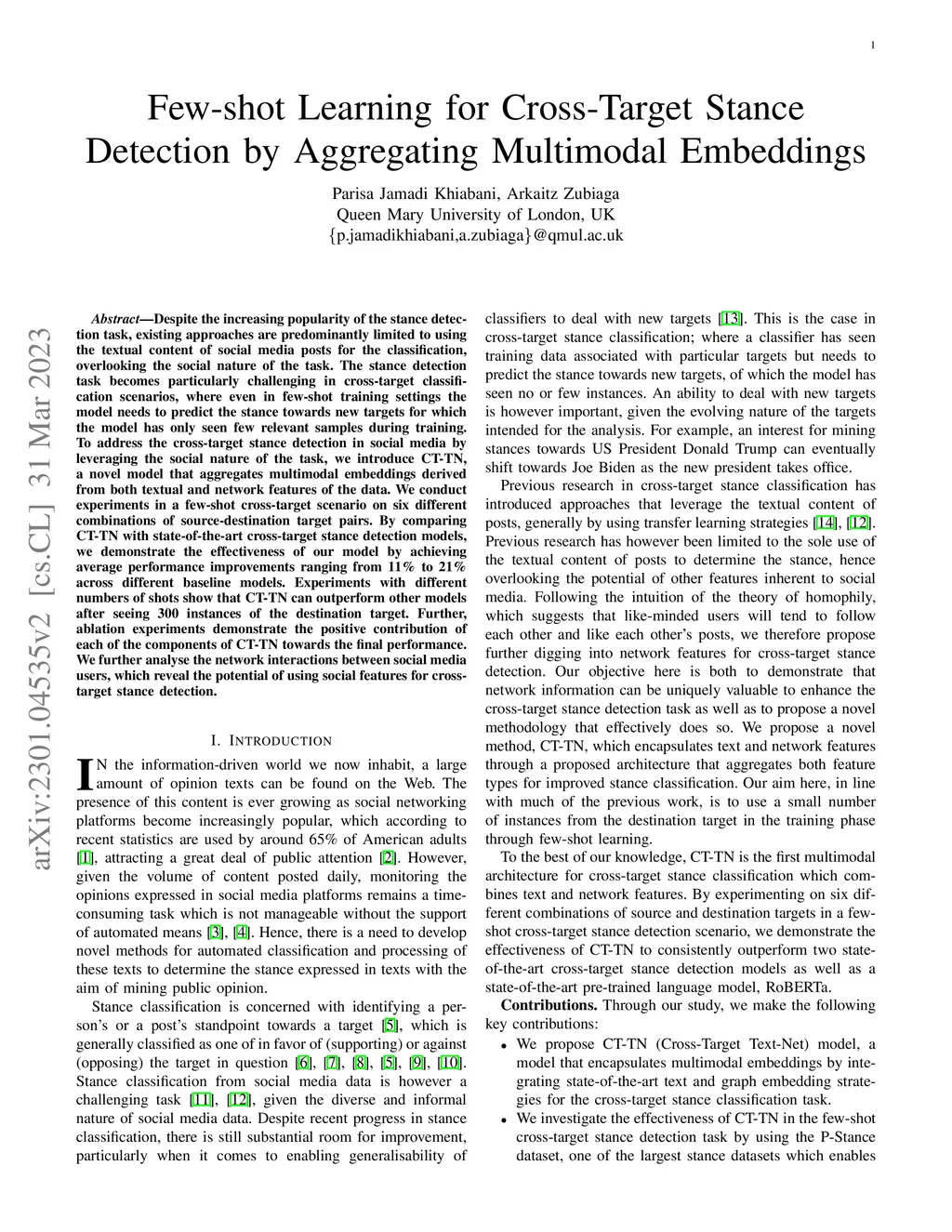 Despite the increasing popularity of the stance detection task, existing approaches are predominantly limited to using the textual content of social media posts for the classification, overlooking the social nature of the task. The stance detection task becomes particularly challenging in cross-target classification scenarios, where even in few-shot training settings the model needs to predict the stance towards new targets for which the model has only seen few relevant samples during training. To address the cross-target stance detection in social media by leveraging the social nature of the task, we introduce CT-TN, a novel model that aggregates multimodal embeddings derived from both textual and network features of the data. We conduct experiments in a few-shot cross-target scenario on six different combinations of source-destination target pairs. By comparing CT-TN with state-of-the-art cross-target stance detection models, we demonstrate the effectiveness of our model by achieving average performance improvements ranging from 11% to 21% across different baseline models. Experiments with different numbers of shots show that CT-TN can outperform other models after seeing 300 instances of the destination target. Further, ablation experiments demonstrate the positive contribution of each of the components of CT-TN towards the final performance. We further analyse the network interactions between social media users, which reveal the potential of using social features for cross-target stance detection.