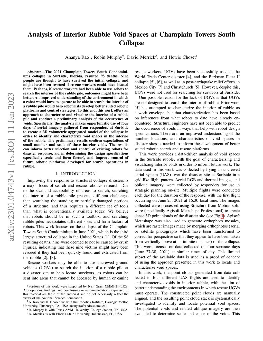 The 2021 Champlain Towers South Condominiums collapse in Surfside, Florida, resulted 98 deaths. Nine people are thought to have survived the initial collapse, and might have been rescued if rescue workers could have located them. Perhaps, if rescue workers had been able to use robots to search the interior of the rubble pile, outcomes might have been better. An improved understanding of the environment in which a robot would have to operate to be able to search the interior of a rubble pile would help roboticists develop better suited robotic platforms and control strategies. To this end, this work offers an approach to characterize and visualize the interior of a rubble pile and conduct a preliminary analysis of the occurrence of voids. Specifically, the analysis makes opportunistic use of four days of aerial imagery gathered from responders at Surfside to create a 3D volumetric aggregated model of the collapse in order to identify and characterize void spaces in the interior of the rubble. The preliminary results confirm expectations of small number and scale of these interior voids. The results can inform better selection and control of existing robots for disaster response, aid in determining the design specifications (specifically scale and form factor), and improve control of future robotic platforms developed for search operations in rubble.