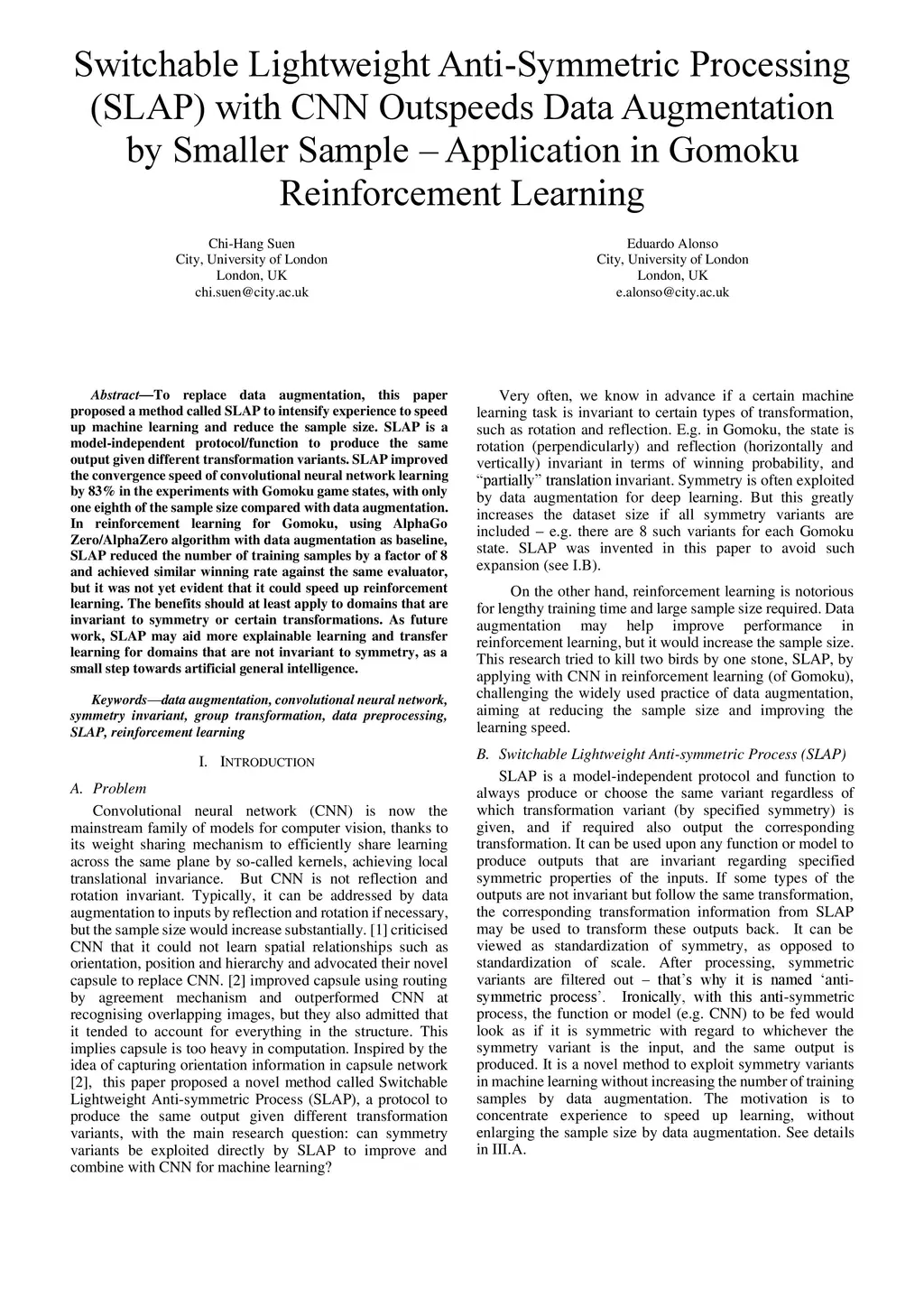 Switchable Lightweight Anti-symmetric Processing (SLAP) with CNN Outspeeds Data Augmentation by Smaller Sample -- Application in Gomoku Reinforcement Learning