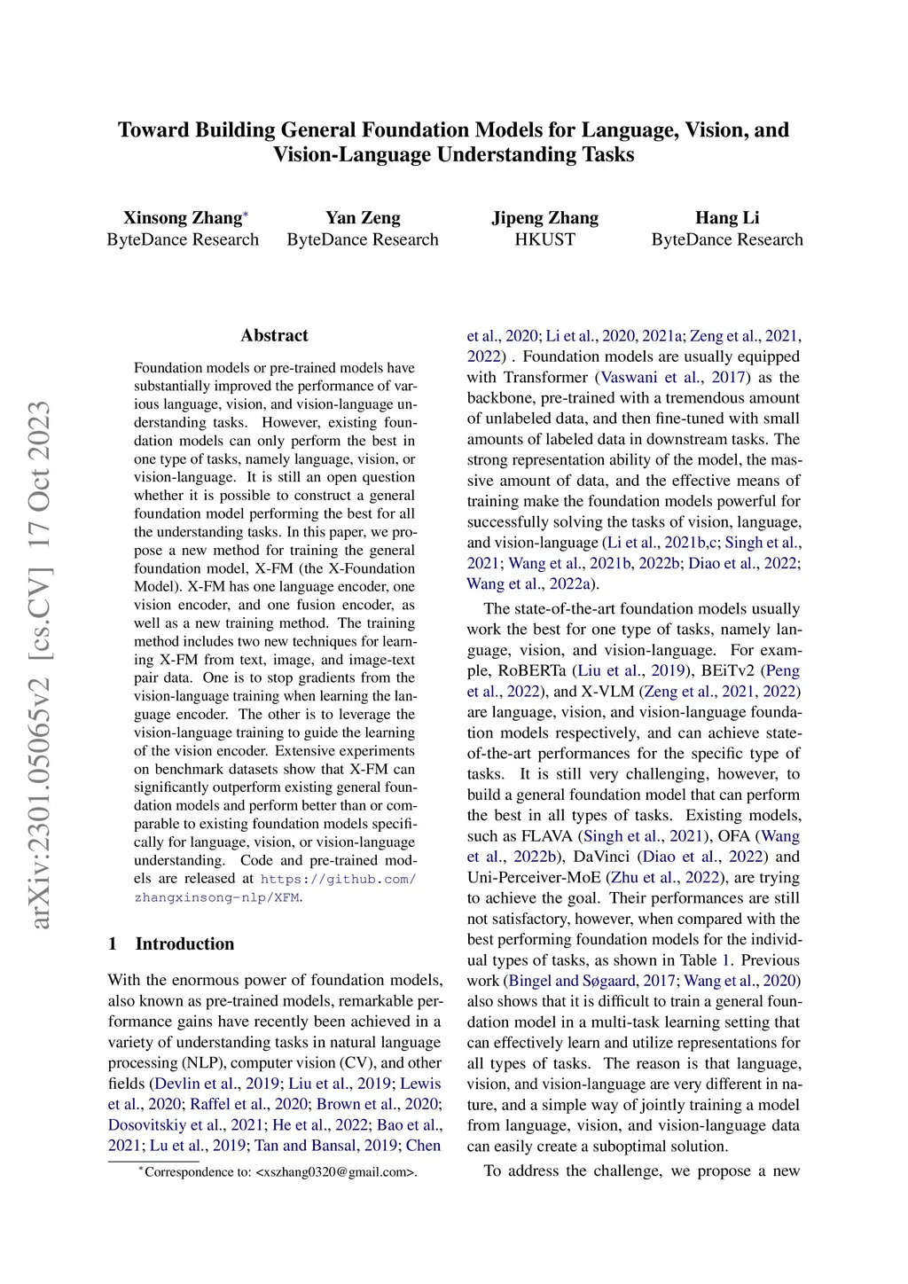 Foundation models or pre-trained models have substantially improved the performance of various language, vision, and vision-language understanding tasks. However, existing foundation models can only perform the best in one type of tasks, namely language, vision, or vision-language. It is still an open question whether it is possible to construct a foundation model performing the best for all the understanding tasks, which we call a general foundation model. In this paper, we propose a new general foundation model, X-FM (the X-Foundation Model). X-FM has one language encoder, one vision encoder, and one fusion encoder, as well as a new training method. The training method includes two new techniques for learning X-FM from text, image, and image-text pair data. One is to stop gradients from the vision-language training when learning the language encoder. The other is to leverage the vision-language training to guide the learning of the vision encoder. Extensive experiments on benchmark datasets show that X-FM can significantly outperform existing general foundation models and perform better than or comparable to existing foundation models specifically for language, vision, or vision-language understanding. Code and pre-trained models are released at https://github.com/zhangxinsong-nlp/XFM.