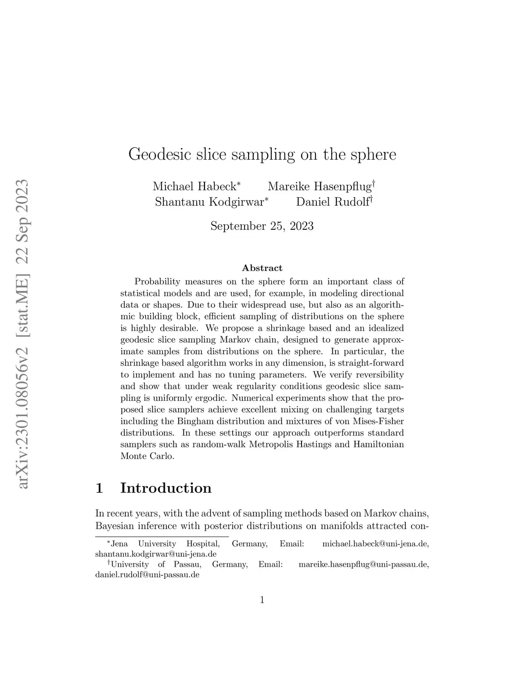 Probability measures on the sphere form an important class of statistical models and are used, for example, in modeling directional data or shapes. Due to their widespread use, but also as an algorithmic building block, efficient sampling of distributions on the sphere is highly desirable. We propose a shrinkage based and an idealized geodesic slice sampling Markov chain, designed to generate approximate samples from distributions on the sphere. In particular, the shrinkage based algorithm works in any dimension, is straight-forward to implement and has no tuning parameters. We verify reversibility and show that under weak regularity conditions geodesic slice sampling is uniformly ergodic. Numerical experiments show that the proposed slice samplers achieve excellent mixing on challenging targets including the Bingham distribution and mixtures of von Mises-Fisher distributions. In these settings our approach outperforms standard samplers such as random-walk Metropolis Hastings and Hamiltonian Monte Carlo.