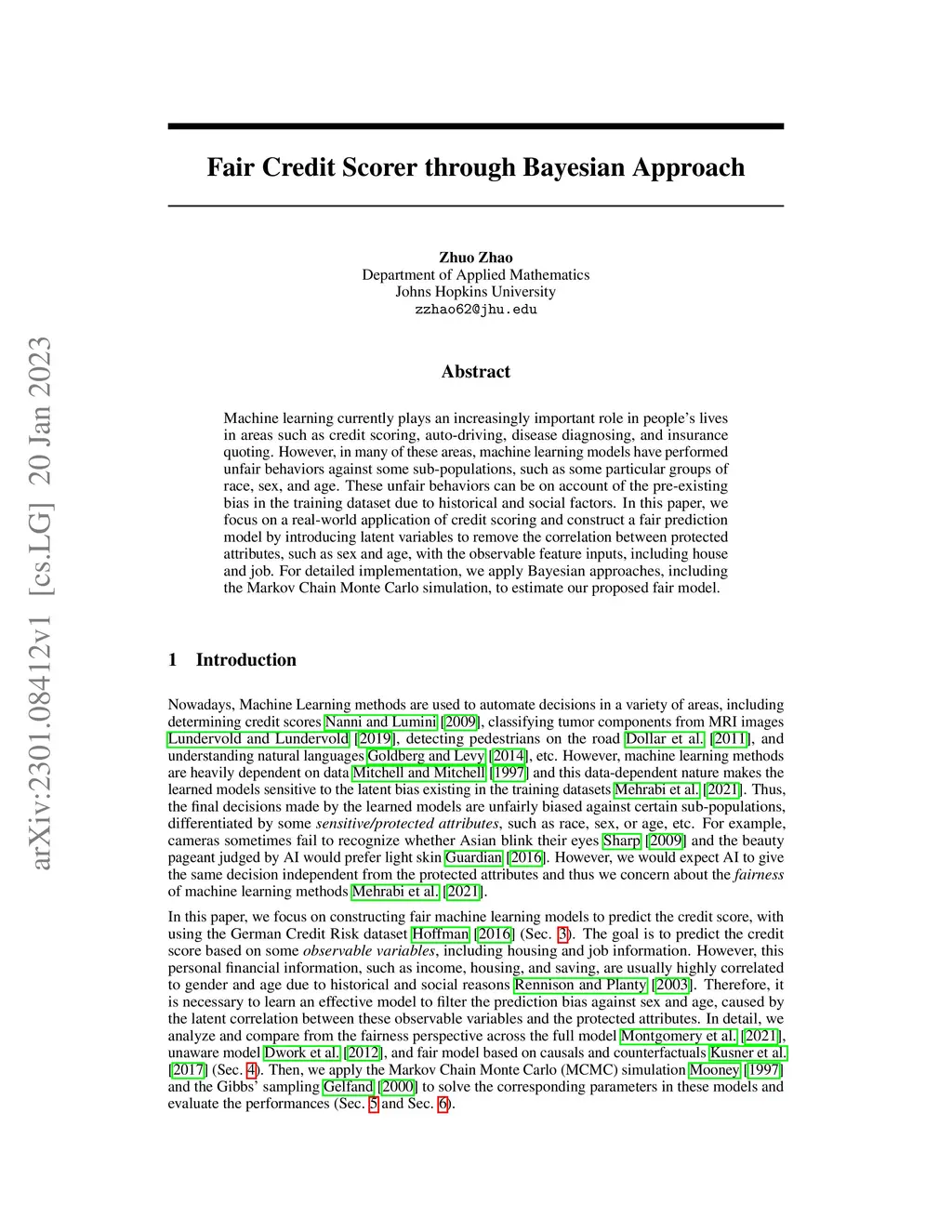 Machine learning currently plays an increasingly important role in people's lives in areas such as credit scoring, auto-driving, disease diagnosing, and insurance quoting. However, in many of these areas, machine learning models have performed unfair behaviors against some sub-populations, such as some particular groups of race, sex, and age. These unfair behaviors can be on account of the pre-existing bias in the training dataset due to historical and social factors. In this paper, we focus on a real-world application of credit scoring and construct a fair prediction model by introducing latent variables to remove the correlation between protected attributes, such as sex and age, with the observable feature inputs, including house and job. For detailed implementation, we apply Bayesian approaches, including the Markov Chain Monte Carlo simulation, to estimate our proposed fair model.