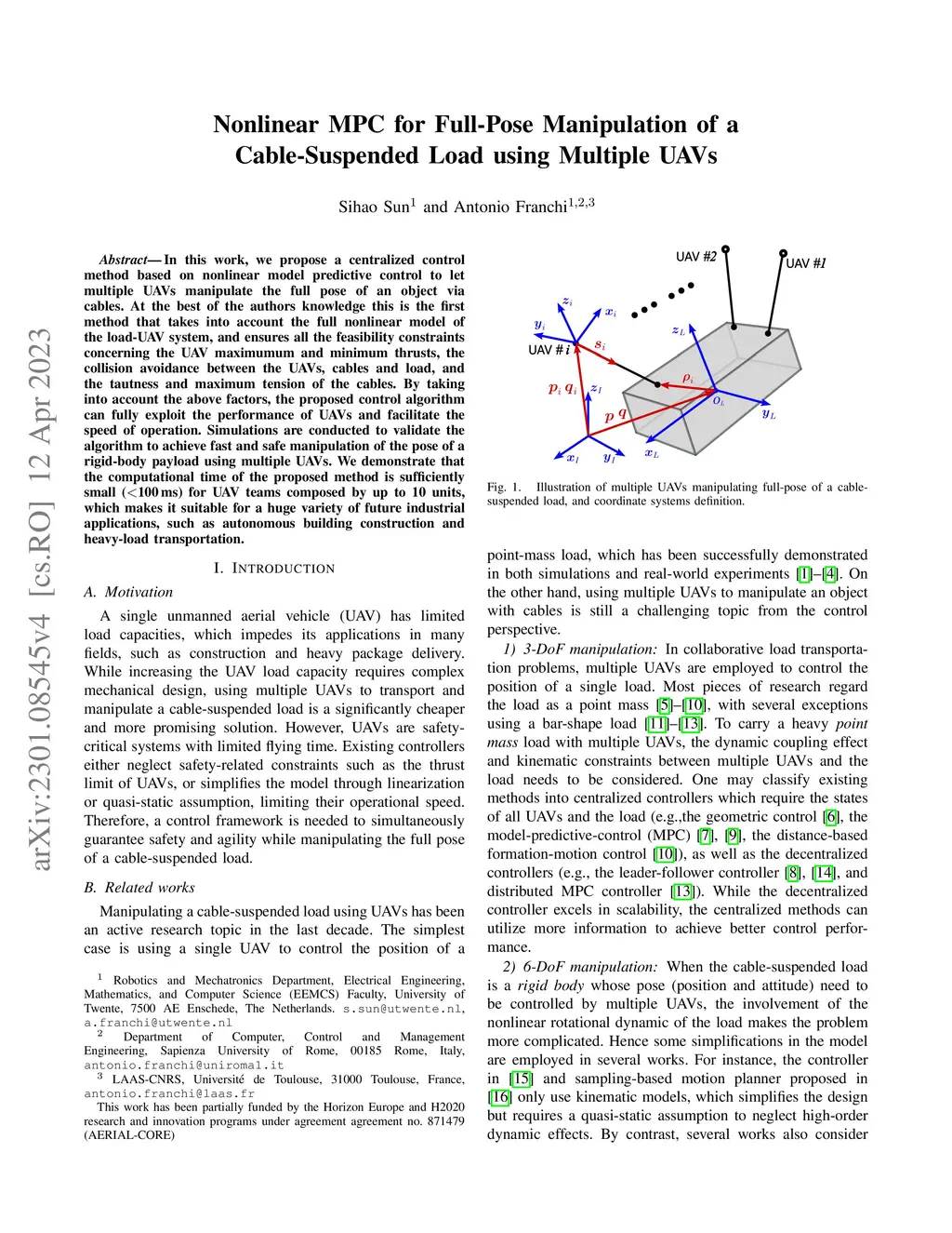 In this work, we propose a centralized control method based on nonlinear model predictive control to let multiple UAVs manipulate the full pose of an object via cables. At the best of the authors knowledge this is the first method that takes into account the full nonlinear model of the load-UAV system, and ensures all the feasibility constraints concerning the UAV maximumum and minimum thrusts, the collision avoidance between the UAVs, cables and load, and the tautness and maximum tension of the cables. By taking into account the above factors, the proposed control algorithm can fully exploit the performance of UAVs and facilitate the speed of operation. Simulations are conducted to validate the algorithm to achieve fast and safe manipulation of the pose of a rigid-body payload using multiple UAVs. We demonstrate that the computational time of the proposed method is sufficiently small (<100 ms) for UAV teams composed by up to 10 units, which makes it suitable for a huge variety of future industrial applications, such as autonomous building construction and heavy-load transportation.