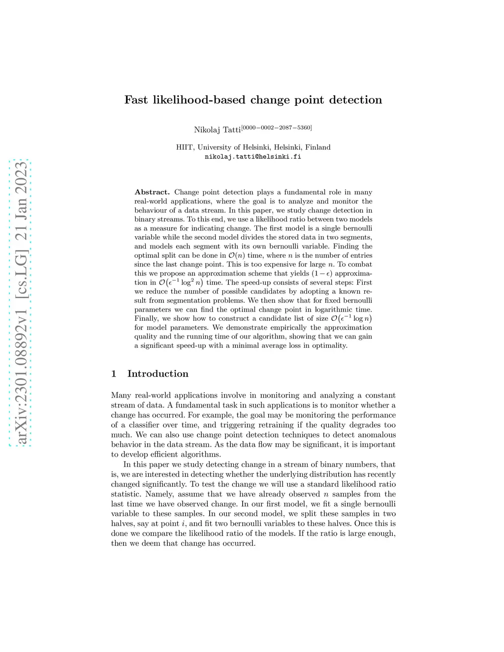 Change point detection plays a fundamental role in many real-world applications, where the goal is to analyze and monitor the behaviour of a data stream. In this paper, we study change detection in binary streams. To this end, we use a likelihood ratio between two models as a measure for indicating change. The first model is a single bernoulli variable while the second model divides the stored data in two segments, and models each segment with its own bernoulli variable. Finding the optimal split can be done in time, where is the number of entries since the last change point. This is too expensive for large . To combat this we propose an approximation scheme that yields approximation in time. The speed-up consists of several steps: First we reduce the number of possible candidates by adopting a known result from segmentation problems. We then show that for fixed bernoulli parameters we can find the optimal change point in logarithmic time. Finally, we show how to construct a candidate list of size for model parameters. We demonstrate empirically the approximation quality and the running time of our algorithm, showing that we can gain a significant speed-up with a minimal average loss in optimality.