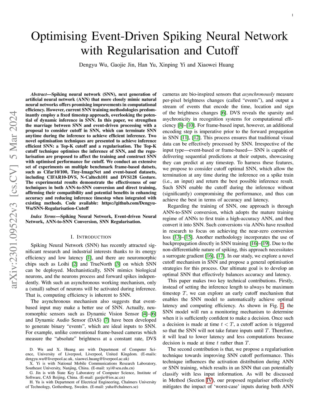 Optimising Event-Driven Spiking Neural Network with Regularisation and Cutoff