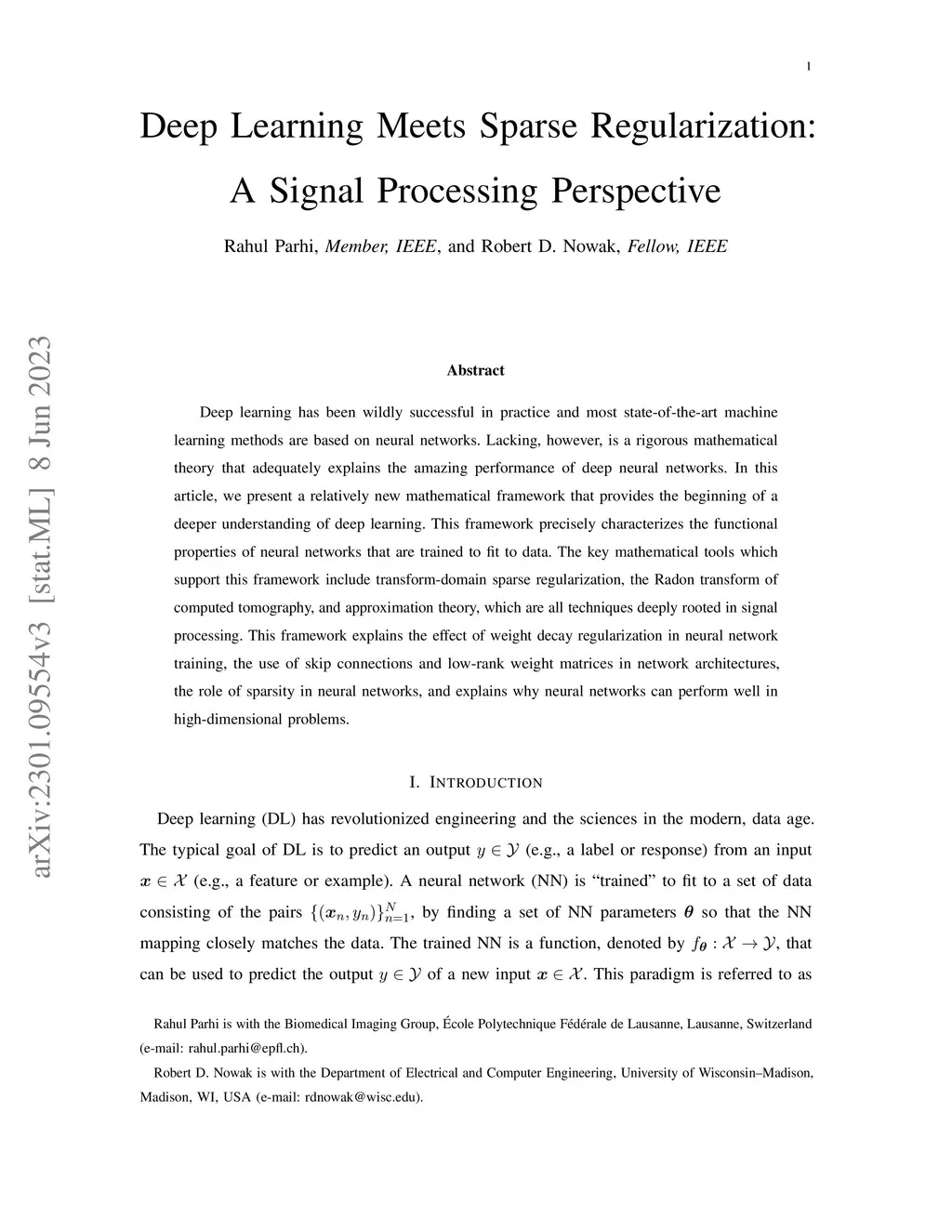 Deep learning has been wildly successful in practice and most state-of-the-art machine learning methods are based on neural networks. Lacking, however, is a rigorous mathematical theory that adequately explains the amazing performance of deep neural networks. In this article, we present a relatively new mathematical framework that provides the beginning of a deeper understanding of deep learning. This framework precisely characterizes the functional properties of neural networks that are trained to fit to data. The key mathematical tools which support this framework include transform-domain sparse regularization, the Radon transform of computed tomography, and approximation theory, which are all techniques deeply rooted in signal processing. This framework explains the effect of weight decay regularization in neural network training, the use of skip connections and low-rank weight matrices in network architectures, the role of sparsity in neural networks, and explains why neural networks can perform well in high-dimensional problems.