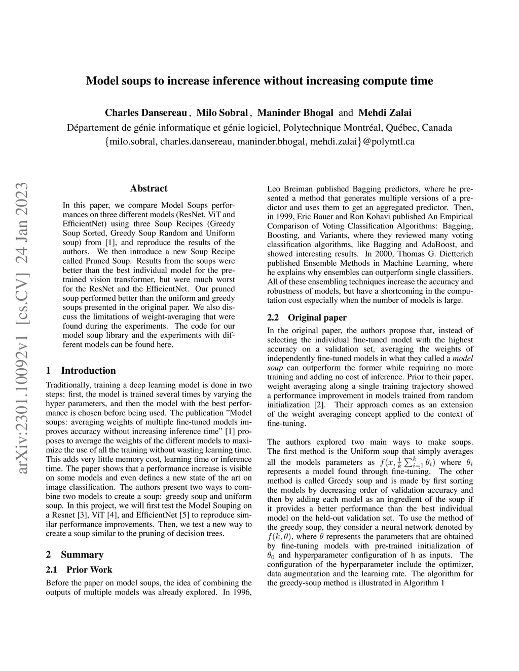 In this paper, we compare Model Soups performances on three different models (ResNet, ViT and EfficientNet) using three Soup Recipes (Greedy Soup Sorted, Greedy Soup Random and Uniform soup) from arXiv:2203.05482, and reproduce the results of the authors. We then introduce a new Soup Recipe called Pruned Soup. Results from the soups were better than the best individual model for the pre-trained vision transformer, but were much worst for the ResNet and the EfficientNet. Our pruned soup performed better than the uniform and greedy soups presented in the original paper. We also discuss the limitations of weight-averaging that were found during the experiments. The code for our model soup library and the experiments with different models can be found here: https://github.com/milo-sobral/ModelSoup