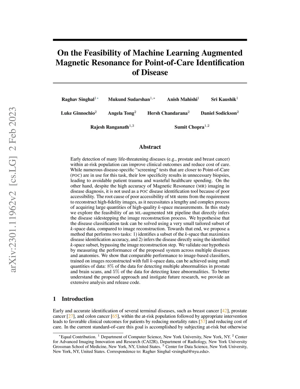 Early detection of many life-threatening diseases (e.g., prostate and breast cancer) within at-risk population can improve clinical outcomes and reduce cost of care. While numerous disease-specific "screening" tests that are closer to Point-of-Care (POC) are in use for this task, their low specificity results in unnecessary biopsies, leading to avoidable patient trauma and wasteful healthcare spending. On the other hand, despite the high accuracy of Magnetic Resonance (MR) imaging in disease diagnosis, it is not used as a POC disease identification tool because of poor accessibility. The root cause of poor accessibility of MR stems from the requirement to reconstruct high-fidelity images, as it necessitates a lengthy and complex process of acquiring large quantities of high-quality k-space measurements. In this study we explore the feasibility of an ML-augmented MR pipeline that directly infers the disease sidestepping the image reconstruction process. We hypothesise that the disease classification task can be solved using a very small tailored subset of k-space data, compared to image reconstruction. Towards that end, we propose a method that performs two tasks: 1) identifies a subset of the k-space that maximizes disease identification accuracy, and 2) infers the disease directly using the identified k-space subset, bypassing the image reconstruction step. We validate our hypothesis by measuring the performance of the proposed system across multiple diseases and anatomies. We show that comparable performance to image-based classifiers, trained on images reconstructed with full k-space data, can be achieved using small quantities of data: 8% of the data for detecting multiple abnormalities in prostate and brain scans, and 5% of the data for knee abnormalities. To better understand the proposed approach and instigate future research, we provide an extensive analysis and release code.