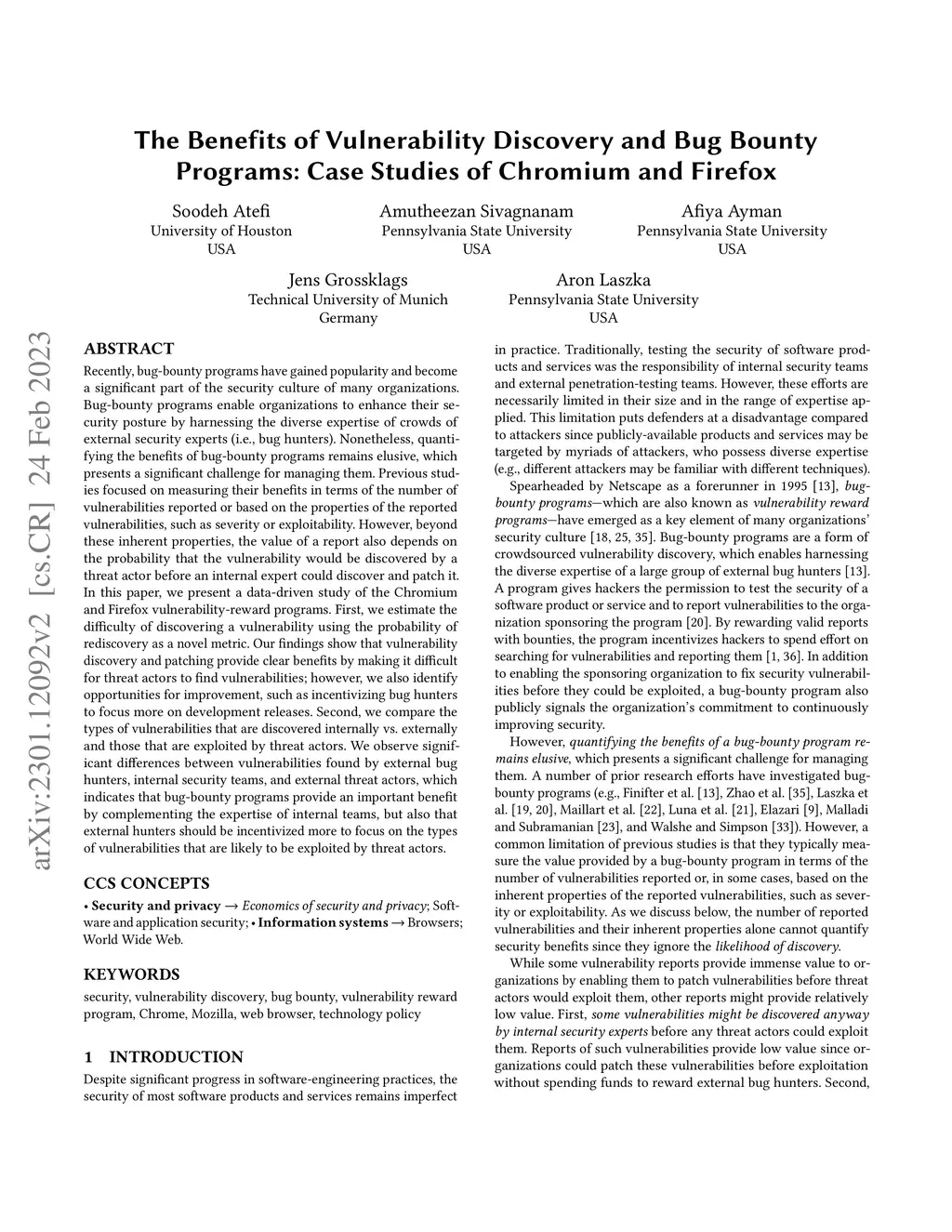 Recently, bug-bounty programs have gained popularity and become a significant part of the security culture of many organizations. Bug-bounty programs enable organizations to enhance their security posture by harnessing the diverse expertise of crowds of external security experts (i.e., bug hunters). Nonetheless, quantifying the benefits of bug-bounty programs remains elusive, which presents a significant challenge for managing them. Previous studies focused on measuring their benefits in terms of the number of vulnerabilities reported or based on the properties of the reported vulnerabilities, such as severity or exploitability. However, beyond these inherent properties, the value of a report also depends on the probability that the vulnerability would be discovered by a threat actor before an internal expert could discover and patch it. In this paper, we present a data-driven study of the Chromium and Firefox vulnerability-reward programs. First, we estimate the difficulty of discovering a vulnerability using the probability of rediscovery as a novel metric. Our findings show that vulnerability discovery and patching provide clear benefits by making it difficult for threat actors to find vulnerabilities; however, we also identify opportunities for improvement, such as incentivizing bug hunters to focus more on development releases. Second, we compare the types of vulnerabilities that are discovered internally vs. externally and those that are exploited by threat actors. We observe significant differences between vulnerabilities found by external bug hunters, internal security teams, and external threat actors, which indicates that bug-bounty programs provide an important benefit by complementing the expertise of internal teams, but also that external hunters should be incentivized more to focus on the types of vulnerabilities that are likely to be exploited by threat actors.