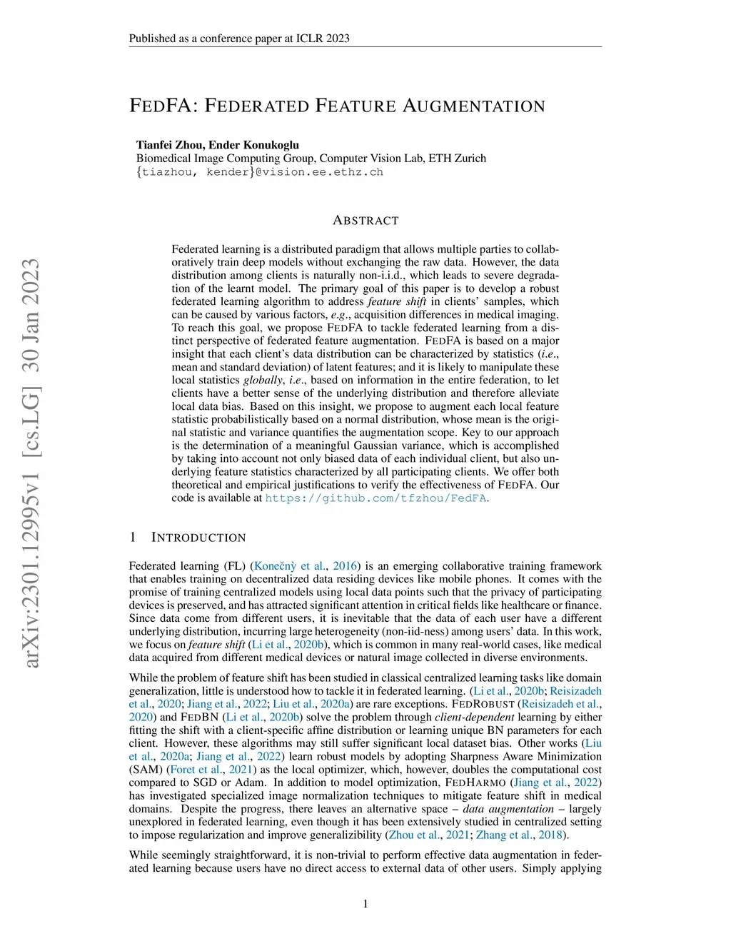 Federated learning is a distributed paradigm that allows multiple parties to collaboratively train deep models without exchanging the raw data. However, the data distribution among clients is naturally non-i.i.d., which leads to severe degradation of the learnt model. The primary goal of this paper is to develop a robust federated learning algorithm to address feature shift in clients' samples, which can be caused by various factors, e.g., acquisition differences in medical imaging. To reach this goal, we propose FedFA to tackle federated learning from a distinct perspective of federated feature augmentation. FedFA is based on a major insight that each client's data distribution can be characterized by statistics (i.e., mean and standard deviation) of latent features; and it is likely to manipulate these local statistics globally, i.e., based on information in the entire federation, to let clients have a better sense of the underlying distribution and therefore alleviate local data bias. Based on this insight, we propose to augment each local feature statistic probabilistically based on a normal distribution, whose mean is the original statistic and variance quantifies the augmentation scope. Key to our approach is the determination of a meaningful Gaussian variance, which is accomplished by taking into account not only biased data of each individual client, but also underlying feature statistics characterized by all participating clients. We offer both theoretical and empirical justifications to verify the effectiveness of FedFA. Our code is available at https://github.com/tfzhou/FedFA.