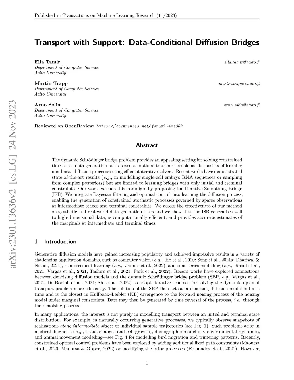 The dynamic Schr\"odinger bridge problem provides an appealing setting for solving constrained time-series data generation tasks posed as optimal transport problems. It consists of learning non-linear diffusion processes using efficient iterative solvers. Recent works have demonstrated state-of-the-art results (eg. in modelling single-cell embryo RNA sequences or sampling from complex posteriors) but are limited to learning bridges with only initial and terminal constraints. Our work extends this paradigm by proposing the Iterative Smoothing Bridge (ISB). We integrate Bayesian filtering and optimal control into learning the diffusion process, enabling the generation of constrained stochastic processes governed by sparse observations at intermediate stages and terminal constraints. We assess the effectiveness of our method on synthetic and real-world data generation tasks and we show that the ISB generalises well to high-dimensional data, is computationally efficient, and provides accurate estimates of the marginals at intermediate and terminal times.