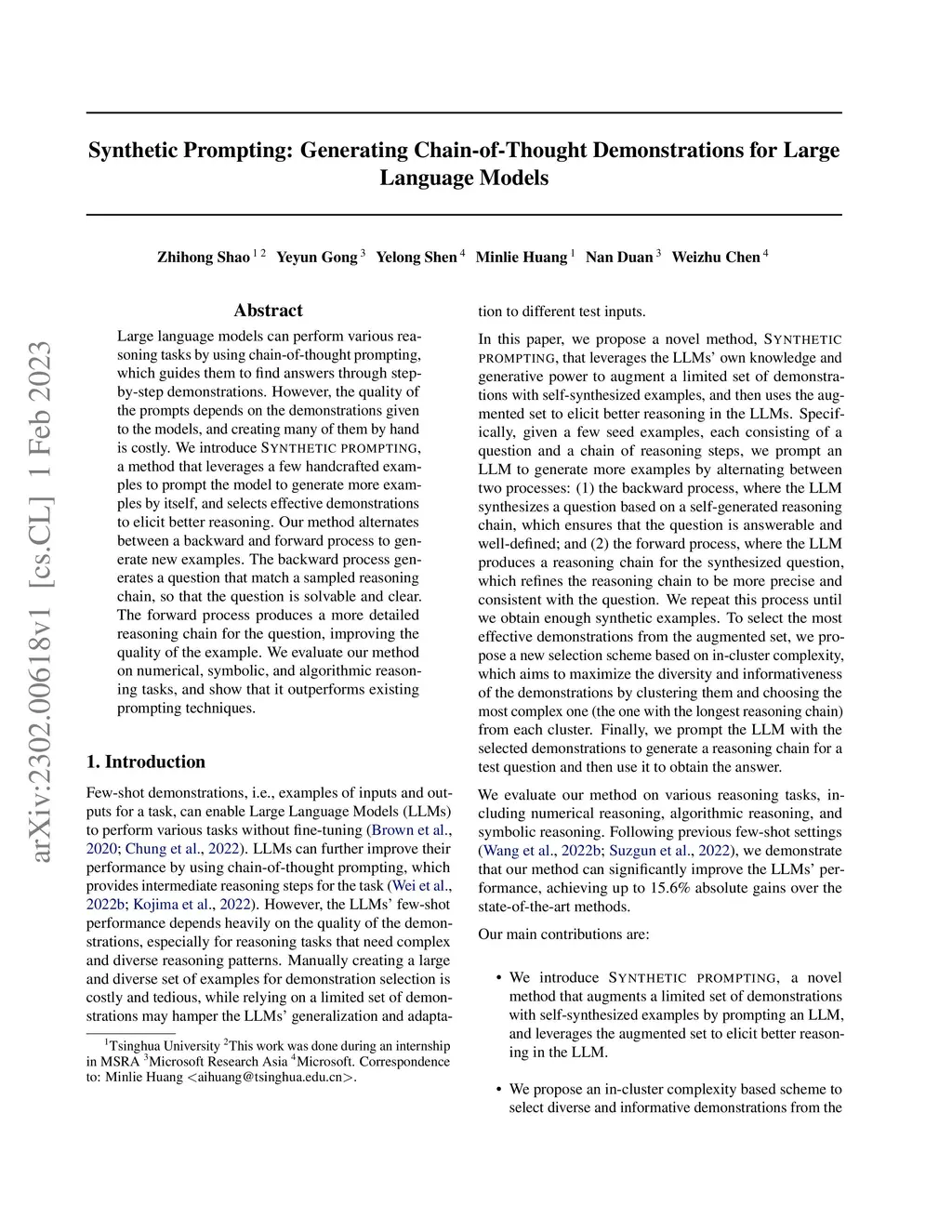 Large language models can perform various reasoning tasks by using chain-of-thought prompting, which guides them to find answers through step-by-step demonstrations. However, the quality of the prompts depends on the demonstrations given to the models, and creating many of them by hand is costly. We introduce Synthetic prompting, a method that leverages a few handcrafted examples to prompt the model to generate more examples by itself, and selects effective demonstrations to elicit better reasoning. Our method alternates between a backward and forward process to generate new examples. The backward process generates a question that match a sampled reasoning chain, so that the question is solvable and clear. The forward process produces a more detailed reasoning chain for the question, improving the quality of the example. We evaluate our method on numerical, symbolic, and algorithmic reasoning tasks, and show that it outperforms existing prompting techniques.