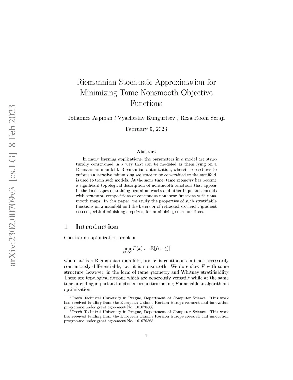 We study the properties of stochastic approximation applied to a tame nondifferentiable function subject to constraints defined by a Riemannian manifold. The objective landscape of tame functions, arising in o-minimal topology extended to a geometric category when generalized to manifolds, exhibits some structure that enables theoretical guarantees of expected function decrease and asymptotic convergence for generic stochastic sub-gradient descent. Recent work has shown that this class of functions faithfully model the loss landscape of deep neural network training objectives, and the autograd operation used in deep learning packages implements a variant of subgradient descent with the correct properties for convergence. Riemannian optimization uses geometric properties of a constraint set to perform a minimization procedure while enforcing adherence to the the optimization variable lying on a Riemannian manifold. This paper presents the first study of tame optimization on Riemannian manifolds, highlighting the rich geometric structure of the problem and confirming the appropriateness of the canonical "SGD" for such a problem with the analysis and numerical reports of a simple Retracted SGD algorithm.