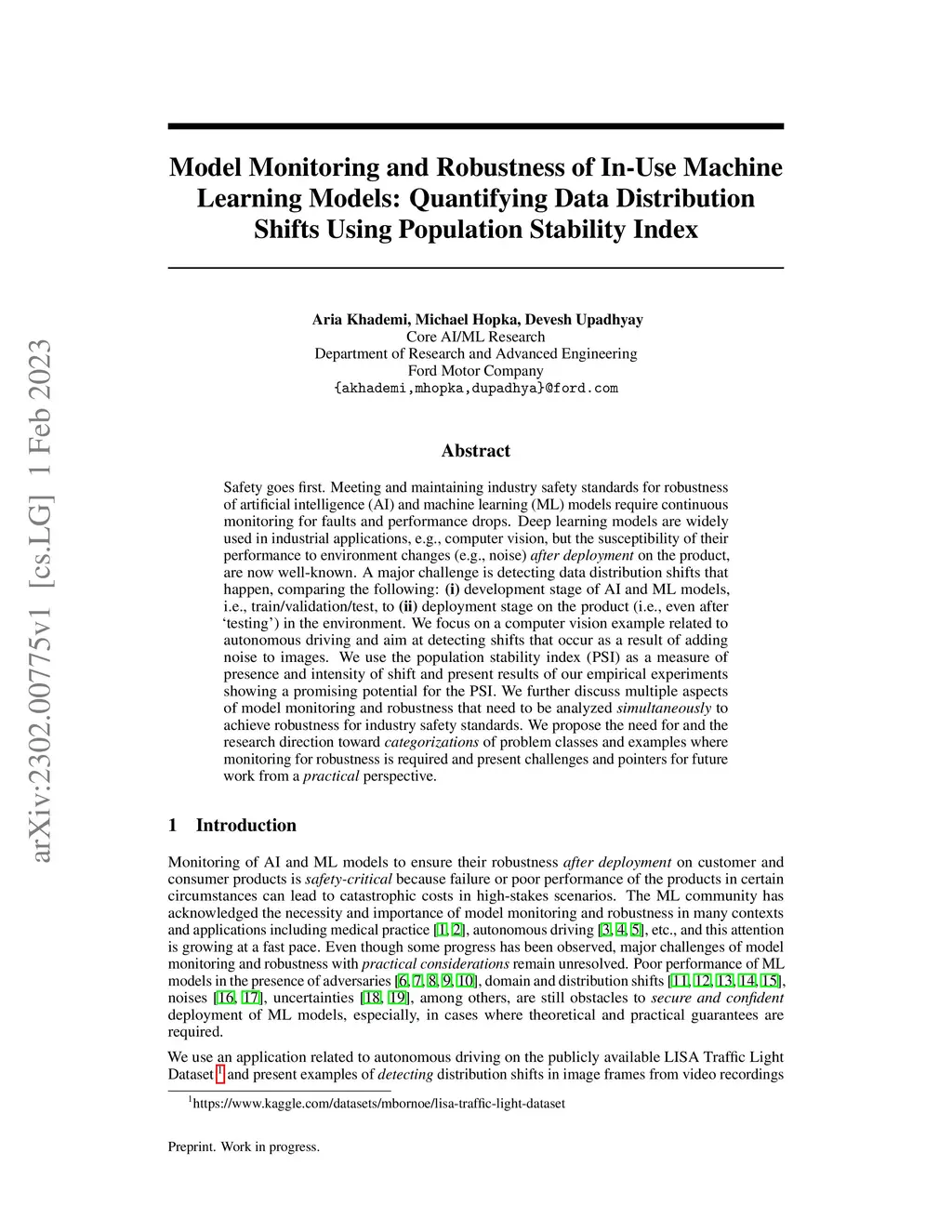 Safety goes first. Meeting and maintaining industry safety standards for robustness of artificial intelligence (AI) and machine learning (ML) models require continuous monitoring for faults and performance drops. Deep learning models are widely used in industrial applications, e.g., computer vision, but the susceptibility of their performance to environment changes (e.g., noise) \emph{after deployment} on the product, are now well-known. A major challenge is detecting data distribution shifts that happen, comparing the following: {\bf (i)} development stage of AI and ML models, i.e., train/validation/test, to {\bf (ii)} deployment stage on the product (i.e., even after `testing') in the environment. We focus on a computer vision example related to autonomous driving and aim at detecting shifts that occur as a result of adding noise to images. We use the population stability index (PSI) as a measure of presence and intensity of shift and present results of our empirical experiments showing a promising potential for the PSI. We further discuss multiple aspects of model monitoring and robustness that need to be analyzed \emph{simultaneously} to achieve robustness for industry safety standards. We propose the need for and the research direction toward \emph{categorizations} of problem classes and examples where monitoring for robustness is required and present challenges and pointers for future work from a \emph{practical} perspective.