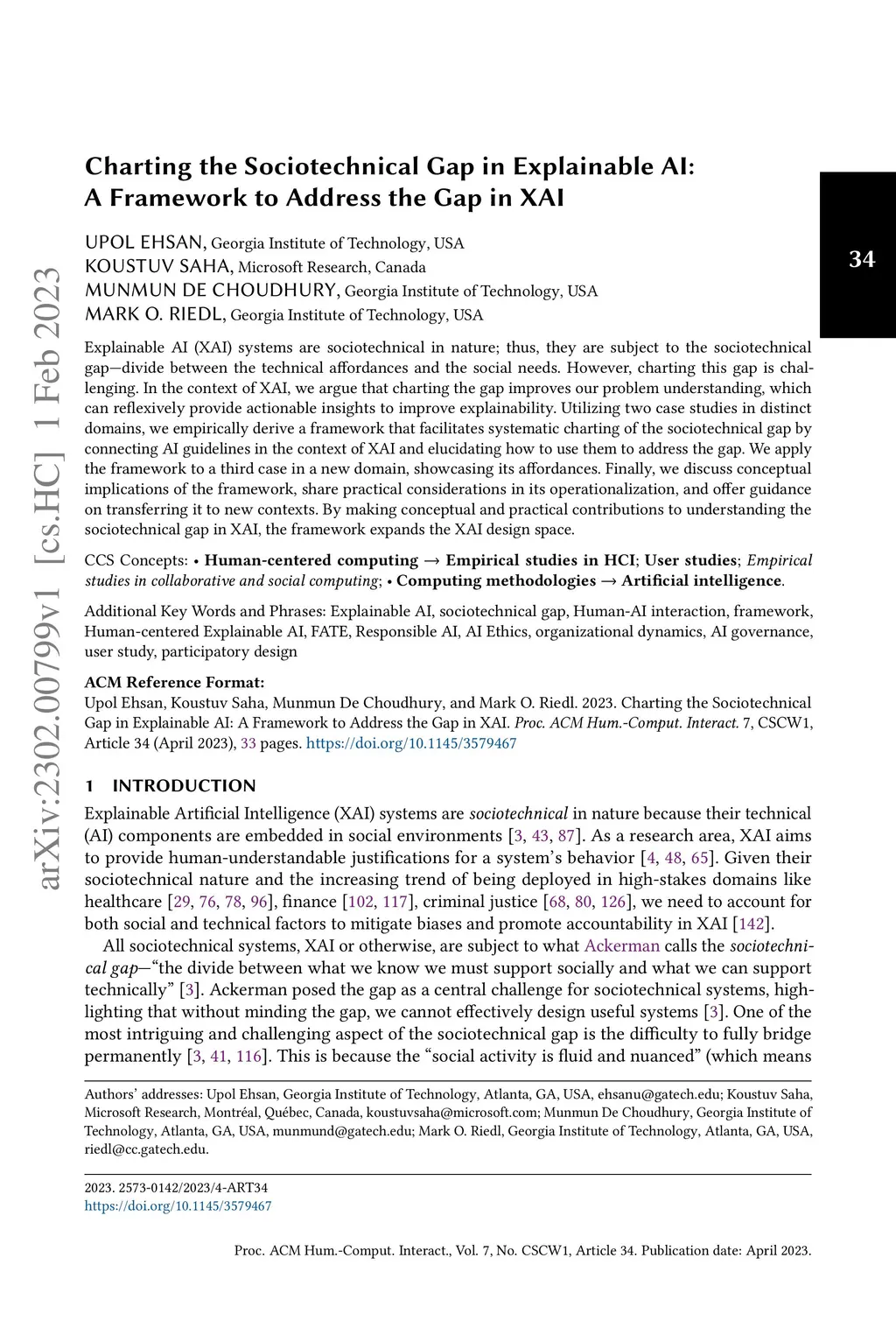 Explainable AI (XAI) systems are sociotechnical in nature; thus, they are subject to the sociotechnical gap--divide between the technical affordances and the social needs. However, charting this gap is challenging. In the context of XAI, we argue that charting the gap improves our problem understanding, which can reflexively provide actionable insights to improve explainability. Utilizing two case studies in distinct domains, we empirically derive a framework that facilitates systematic charting of the sociotechnical gap by connecting AI guidelines in the context of XAI and elucidating how to use them to address the gap. We apply the framework to a third case in a new domain, showcasing its affordances. Finally, we discuss conceptual implications of the framework, share practical considerations in its operationalization, and offer guidance on transferring it to new contexts. By making conceptual and practical contributions to understanding the sociotechnical gap in XAI, the framework expands the XAI design space.