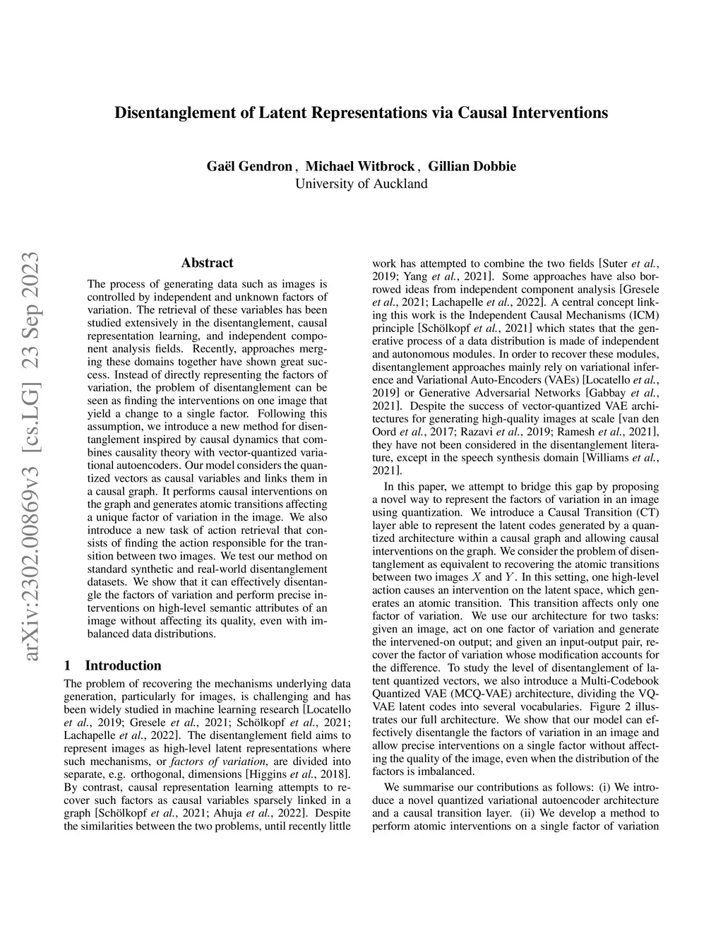 The process of generating data such as images is controlled by independent and unknown factors of variation. The retrieval of these variables has been studied extensively in the disentanglement, causal representation learning, and independent component analysis fields. Recently, approaches merging these domains together have shown great success. Instead of directly representing the factors of variation, the problem of disentanglement can be seen as finding the interventions on one image that yield a change to a single factor. Following this assumption, we introduce a new method for disentanglement inspired by causal dynamics that combines causality theory with vector-quantized variational autoencoders. Our model considers the quantized vectors as causal variables and links them in a causal graph. It performs causal interventions on the graph and generates atomic transitions affecting a unique factor of variation in the image. We also introduce a new task of action retrieval that consists of finding the action responsible for the transition between two images. We test our method on standard synthetic and real-world disentanglement datasets. We show that it can effectively disentangle the factors of variation and perform precise interventions on high-level semantic attributes of an image without affecting its quality, even with imbalanced data distributions.