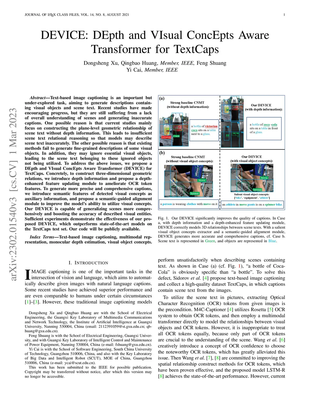 DEVICE: Depth and Visual Concepts Aware Transformer for OCR-based Image Captioning