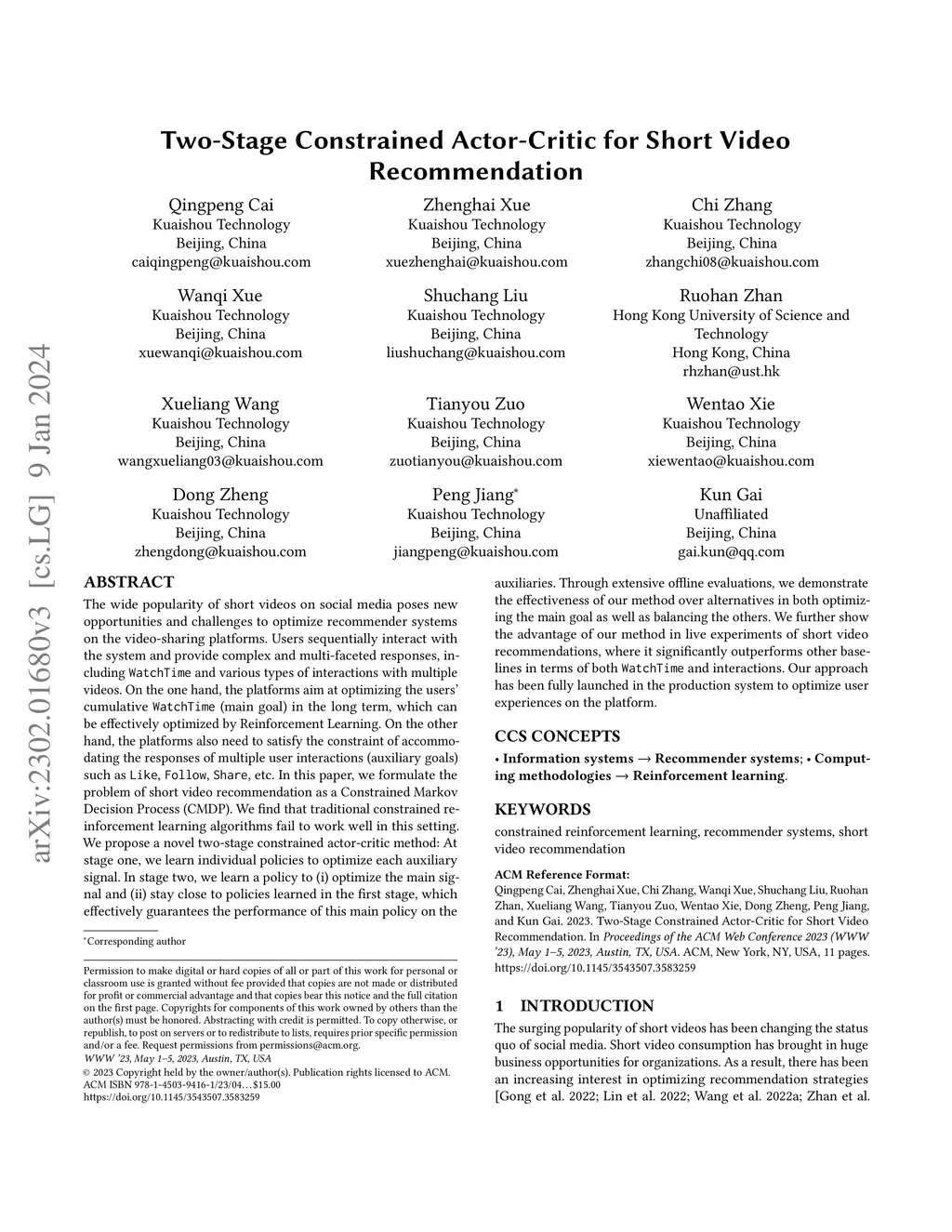 Two-Stage Constrained Actor-Critic for Short Video Recommendation