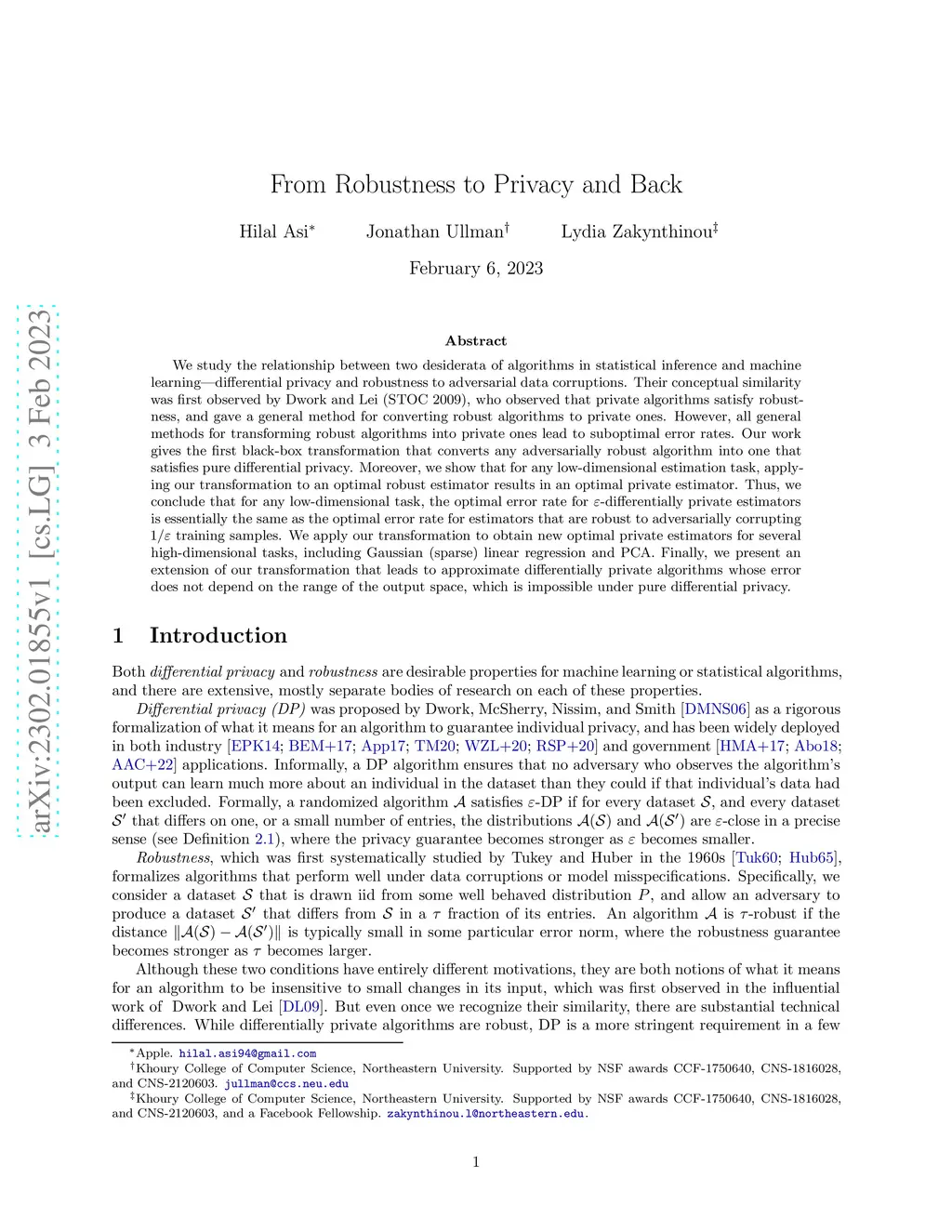 We study the relationship between two desiderata of algorithms in statistical inference and machine learning: differential privacy and robustness to adversarial data corruptions. Their conceptual similarity was first observed by Dwork and Lei (STOC 2009), who observed that private algorithms satisfy robustness, and gave a general method for converting robust algorithms to private ones. However, all general methods for transforming robust algorithms into private ones lead to suboptimal error rates. Our work gives the first black-box transformation that converts any adversarially robust algorithm into one that satisfies pure differential privacy. Moreover, we show that for any low-dimensional estimation task, applying our transformation to an optimal robust estimator results in an optimal private estimator. Thus, we conclude that for any low-dimensional task, the optimal error rate for -differentially private estimators is essentially the same as the optimal error rate for estimators that are robust to adversarially corrupting training samples. We apply our transformation to obtain new optimal private estimators for several high-dimensional tasks, including Gaussian (sparse) linear regression and PCA. Finally, we present an extension of our transformation that leads to approximate differentially private algorithms whose error does not depend on the range of the output space, which is impossible under pure differential privacy.