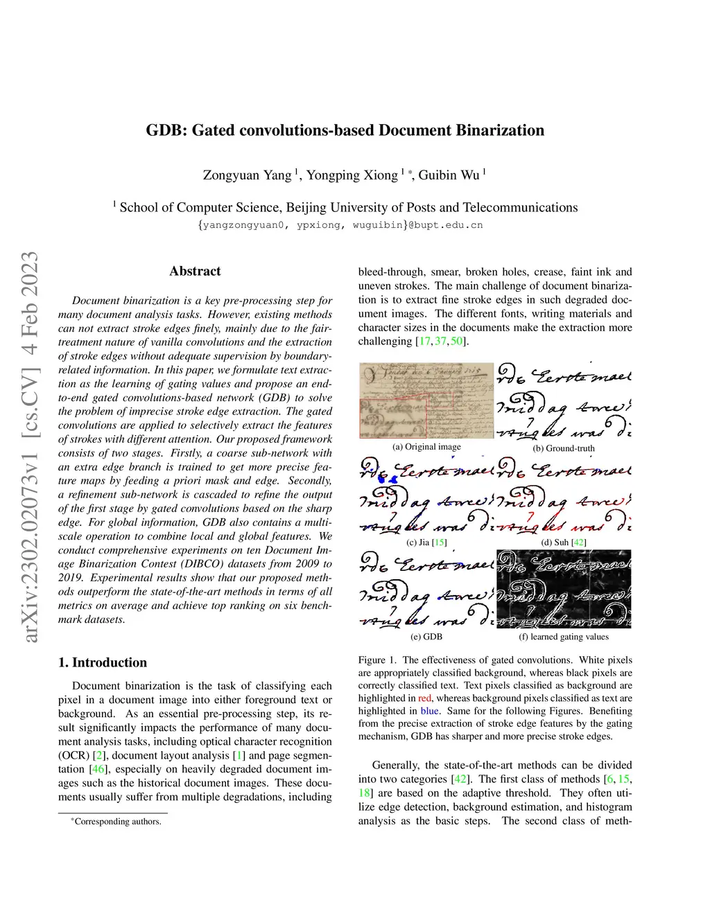 Document binarization is a key pre-processing step for many document analysis tasks. However, existing methods can not extract stroke edges finely, mainly due to the fair-treatment nature of vanilla convolutions and the extraction of stroke edges without adequate supervision by boundary-related information. In this paper, we formulate text extraction as the learning of gating values and propose an end-to-end gated convolutions-based network (GDB) to solve the problem of imprecise stroke edge extraction. The gated convolutions are applied to selectively extract the features of strokes with different attention. Our proposed framework consists of two stages. Firstly, a coarse sub-network with an extra edge branch is trained to get more precise feature maps by feeding a priori mask and edge. Secondly, a refinement sub-network is cascaded to refine the output of the first stage by gated convolutions based on the sharp edge. For global information, GDB also contains a multi-scale operation to combine local and global features. We conduct comprehensive experiments on ten Document Image Binarization Contest (DIBCO) datasets from 2009 to 2019. Experimental results show that our proposed methods outperform the state-of-the-art methods in terms of all metrics on average and achieve top ranking on six benchmark datasets.